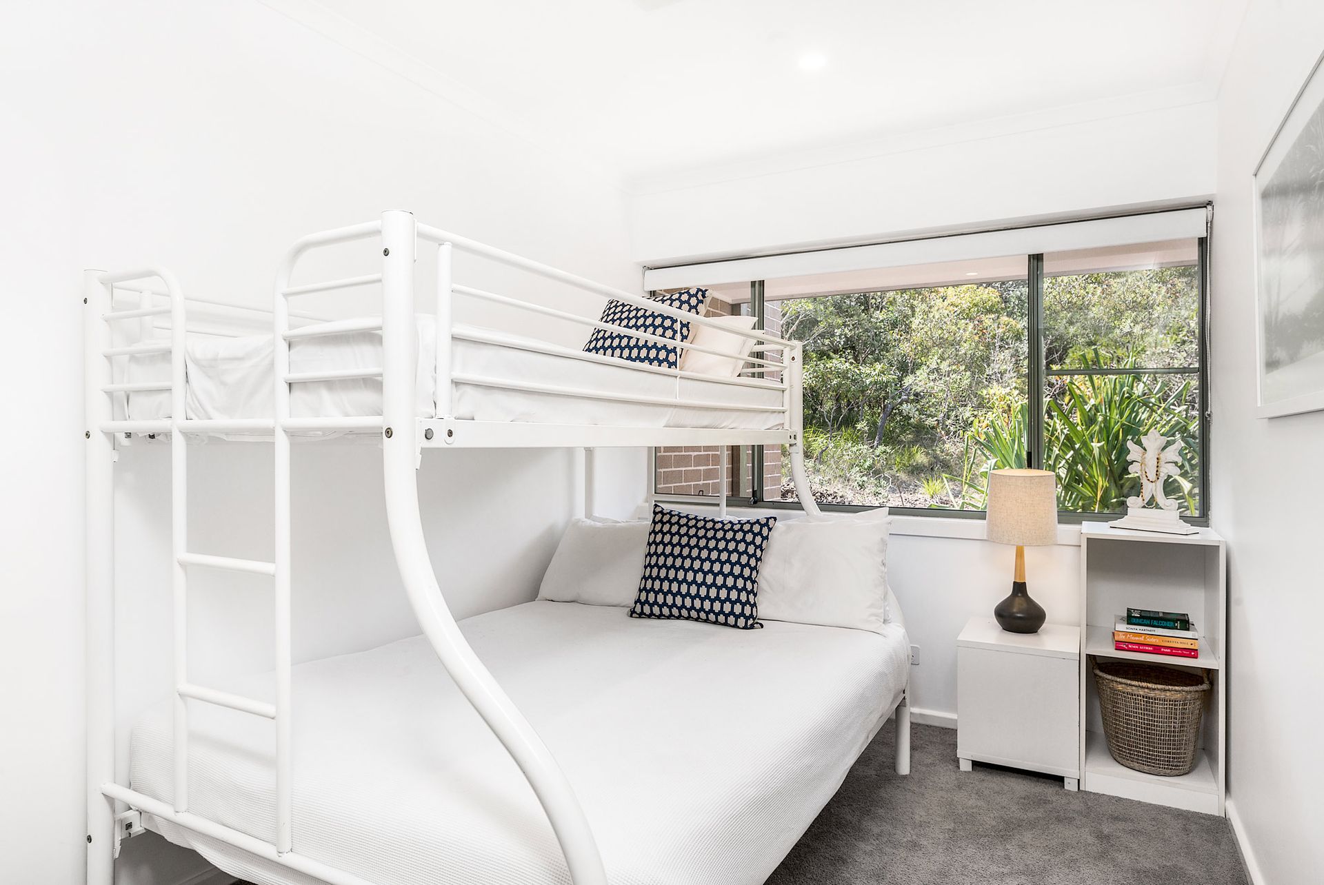 The second bedroom features another queen bed while the third bedroom offers a family-friendly bunk arrangement with a double on the bottom and single on top. Each bedroom comes equipped with reverse-cycle air conditioning for comfortable year-round sleeping.