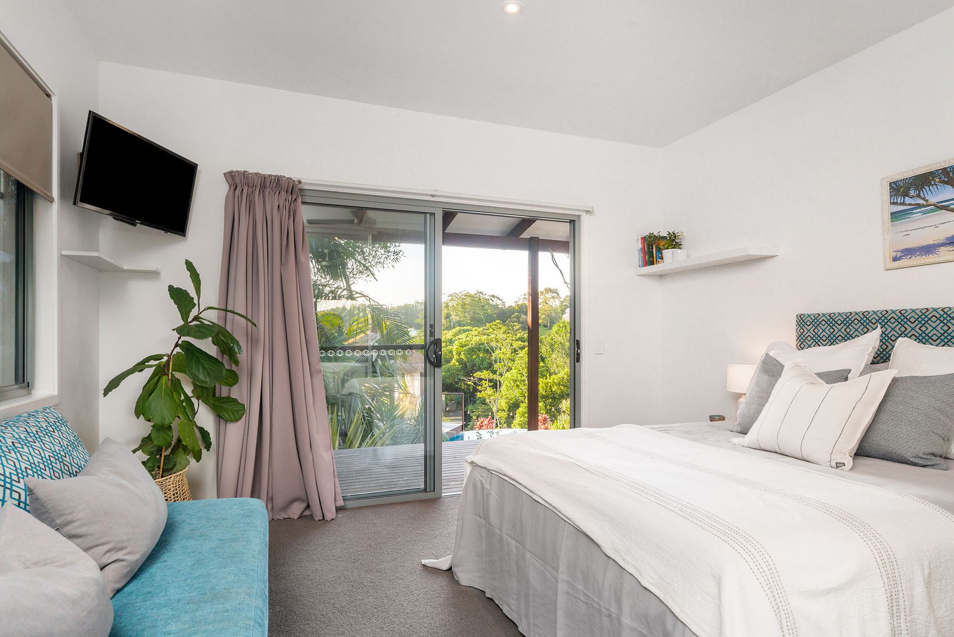 The property elegantly extends to a second wing, housing a TV room with convertible lounge, 2 queen bedrooms with built-in wardrobes, and a second bathroom featuring separate shower and bath. Each room opens directly onto the lower deck, providing uninterrupted views across the pool and valley beyond.