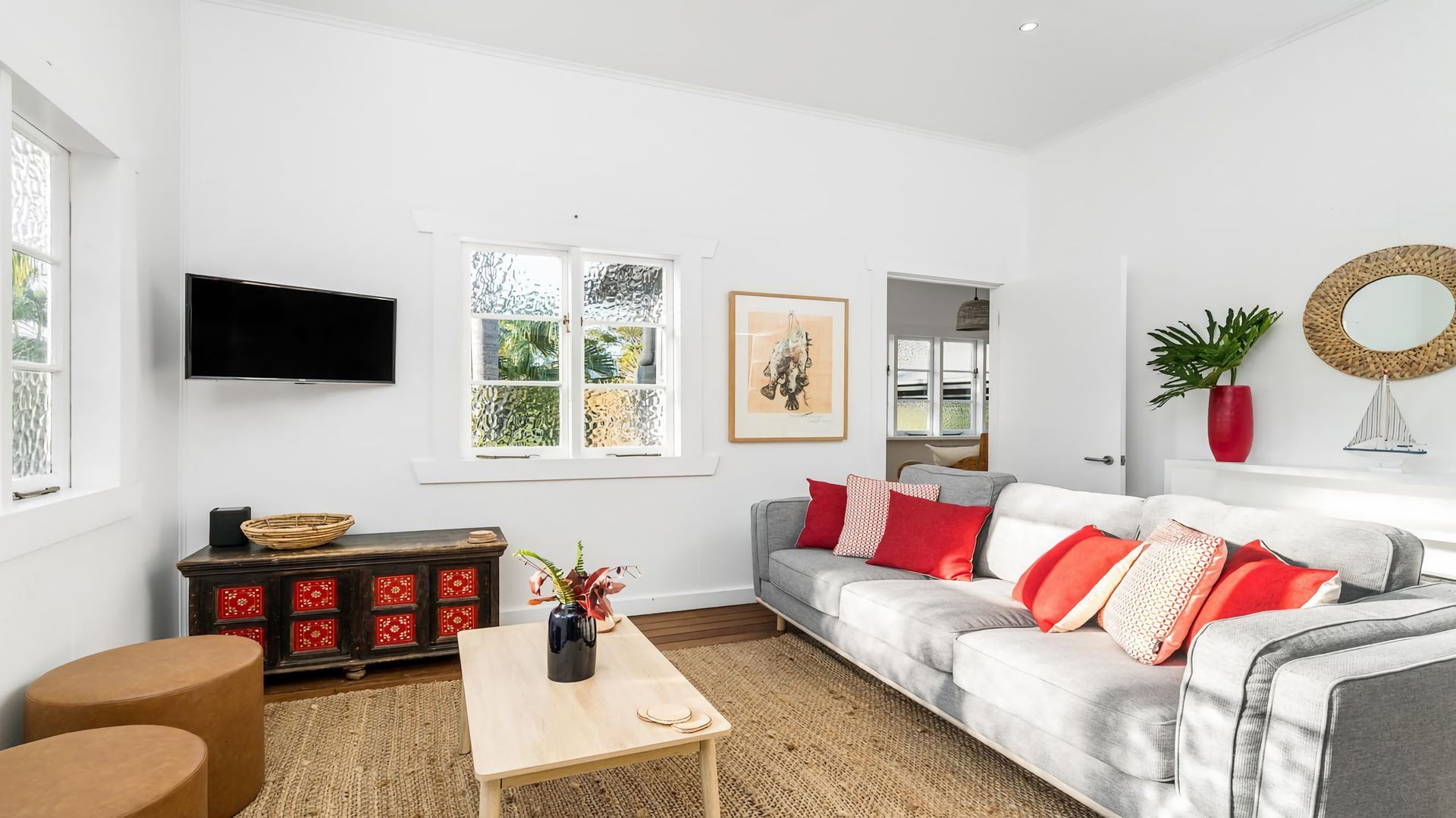 The elegantly styled interior blends bohemian charm with modern comfort. Rich, deep-coloured soft furnishings and organic woven textiles create a striking contrast against crisp white walls. Original timber floorboards preserve the home's character, while high ceilings, Cathedral glass and louvered windows welcome abundant natural light and refreshing afternoon ocean breezes.