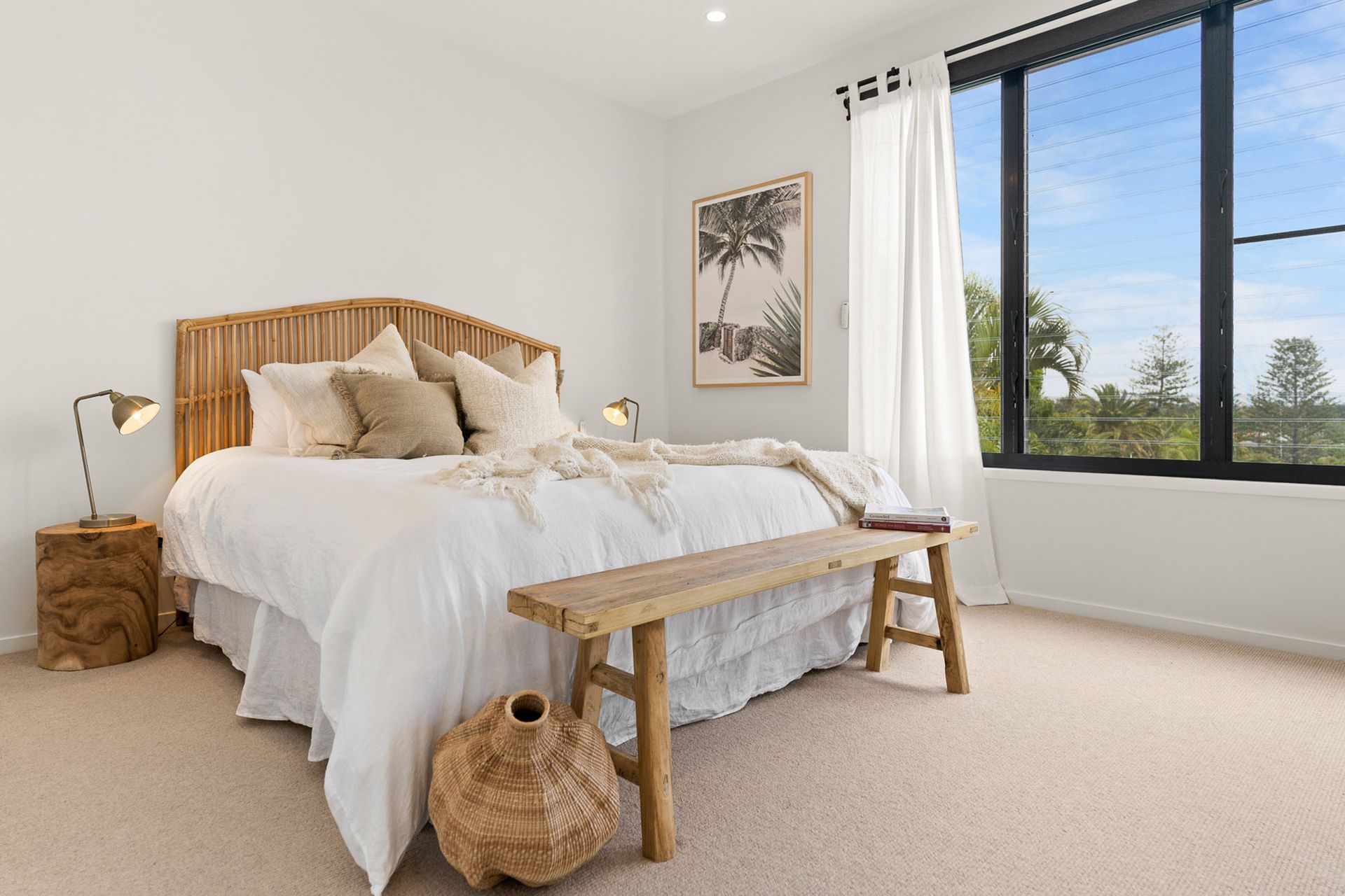 This freshly styled area captures natural light through floor-to-ceiling windows, offering sweeping views across Byron township to Mt Warning and the picturesque hinterland beyond. Glide across polished timber floors to designer rugs that cushion your feet as you relax on plush, comfortable seating. The space features reverse-cycle air conditioning for year-round comfort.