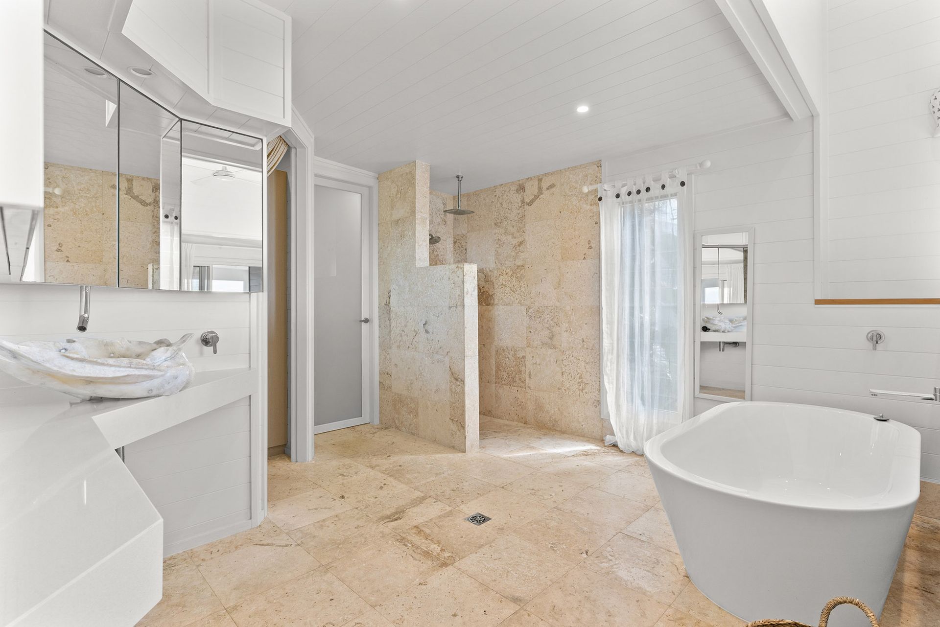 The Beach House offers 6 beautifully appointed bedrooms and 4 bathrooms to comfortably accommodate up to 12 guests. Each bedroom features ceiling fans, luxurious linens, and elegant curtains. Three bedrooms are configured as master suites, with the primary master bedroom featuring a unique open-plan design where the ensuite bathroom blends with the sleeping area, separated by a small divider between the bed and bath.