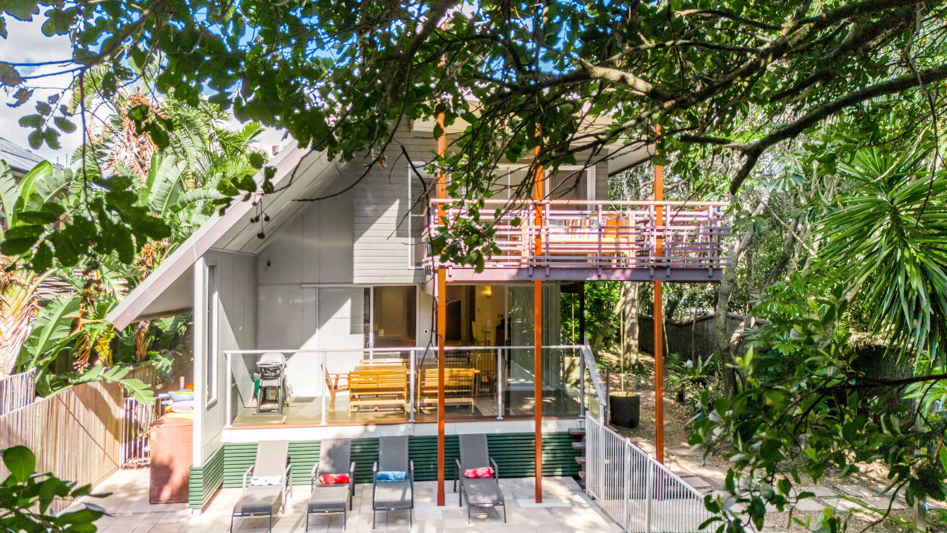 Ariel's is an architecturally striking property blending contemporary luxury with relaxed beachside living. Perfect for gatherings, this home features a cutting-edge kitchen, spacious open-plan dining area, and inviting living room with fireplace. Step onto the beautiful timber deck overlooking the crystal-clear pool and lush tropical gardens. Unwind in the media room equipped with a large flat-screen TV and reverse cycle air conditioning for year-round comfort.