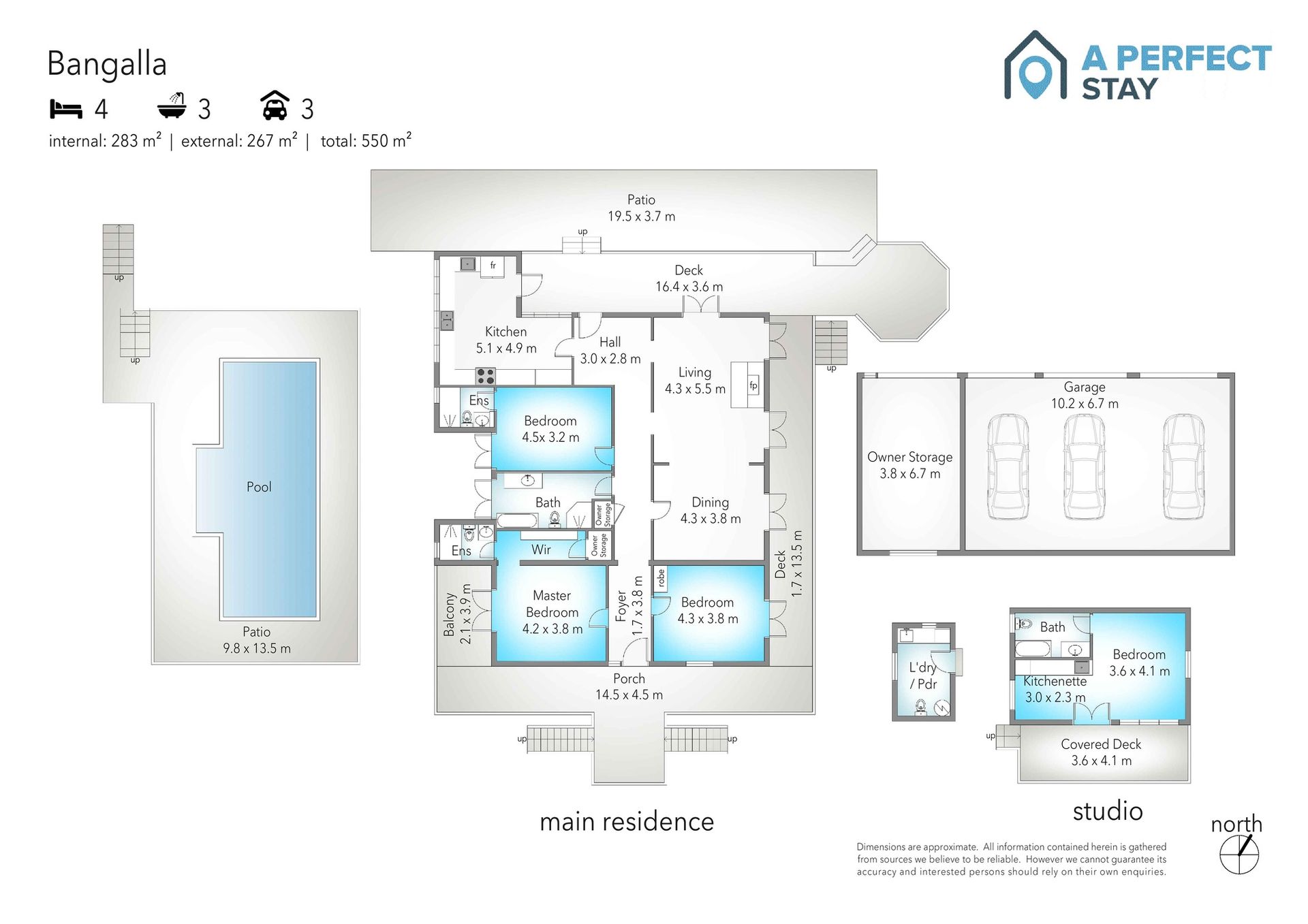 The main house features 3 generous and bright bedrooms, offering versatile sleeping arrangements ideal for large groups and extended families. Each bedroom opens directly onto the verandah, creating seamless indoor-outdoor living. The studio provides a luxurious queen-sized bed complemented by a stylish ensuite bathroom.