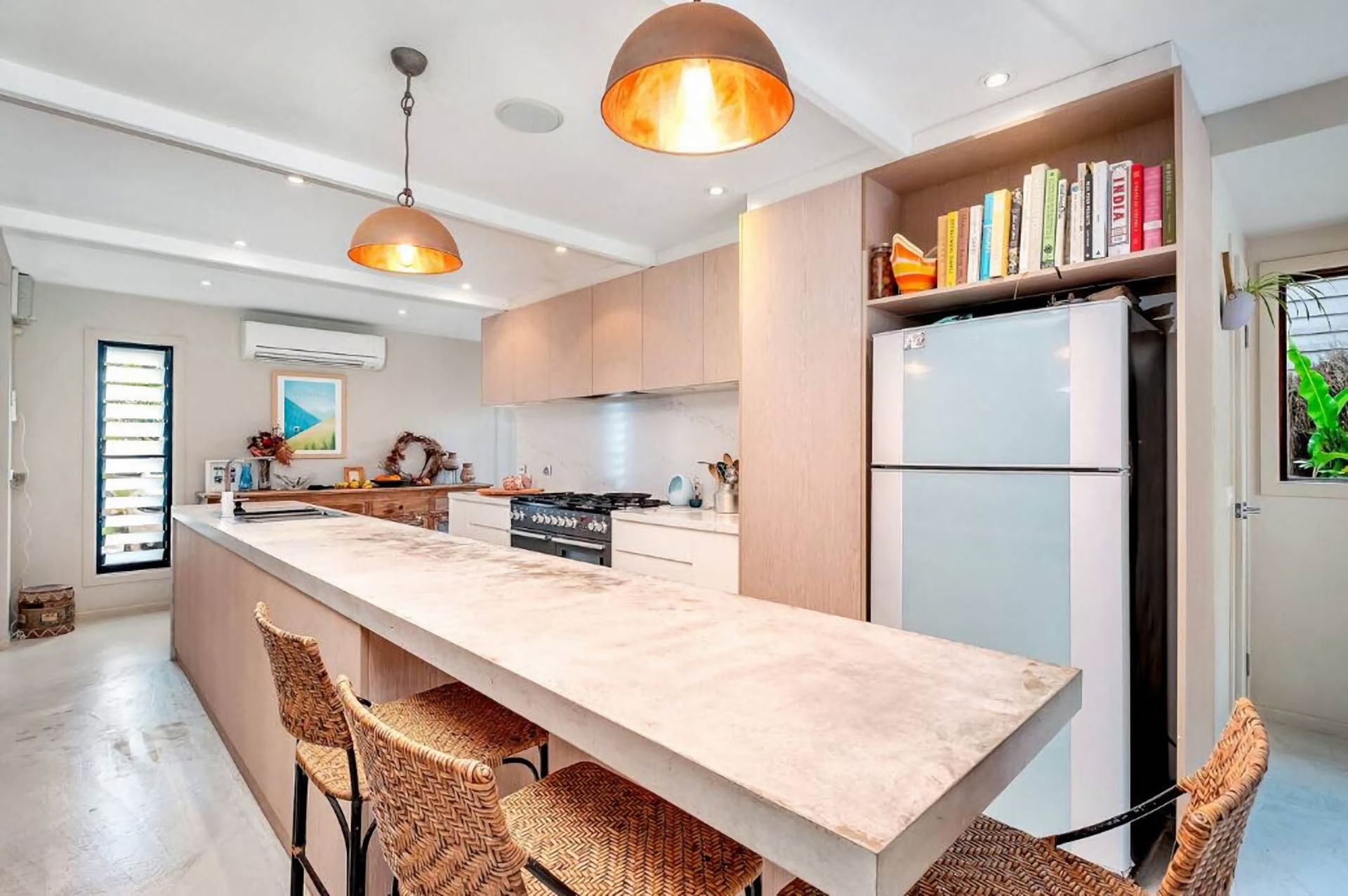 A central, fully-equipped kitchen, is a chef's delight with a large gas cooker, two ovens and industrial concrete bench tops. The kitchen provides plenty of space for you to enjoy the company of friends and family.