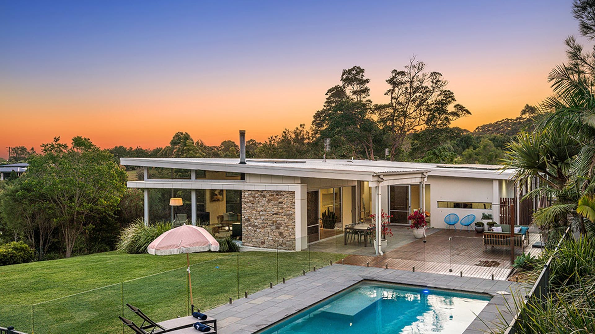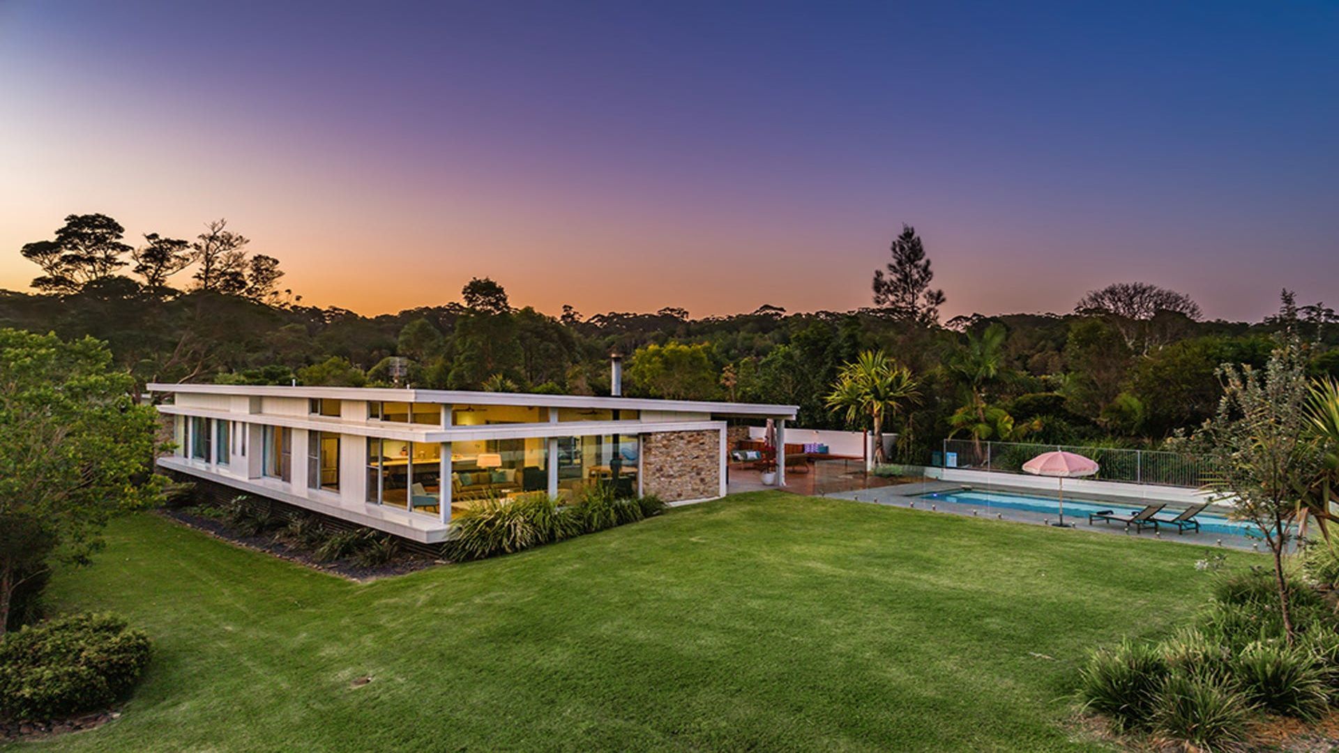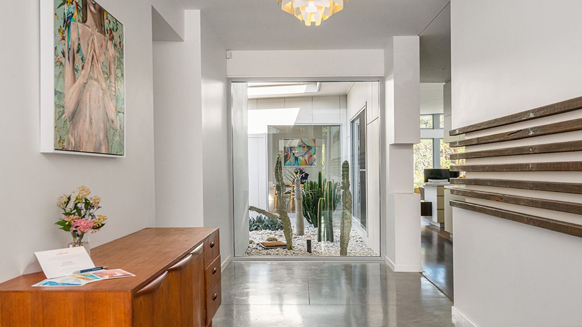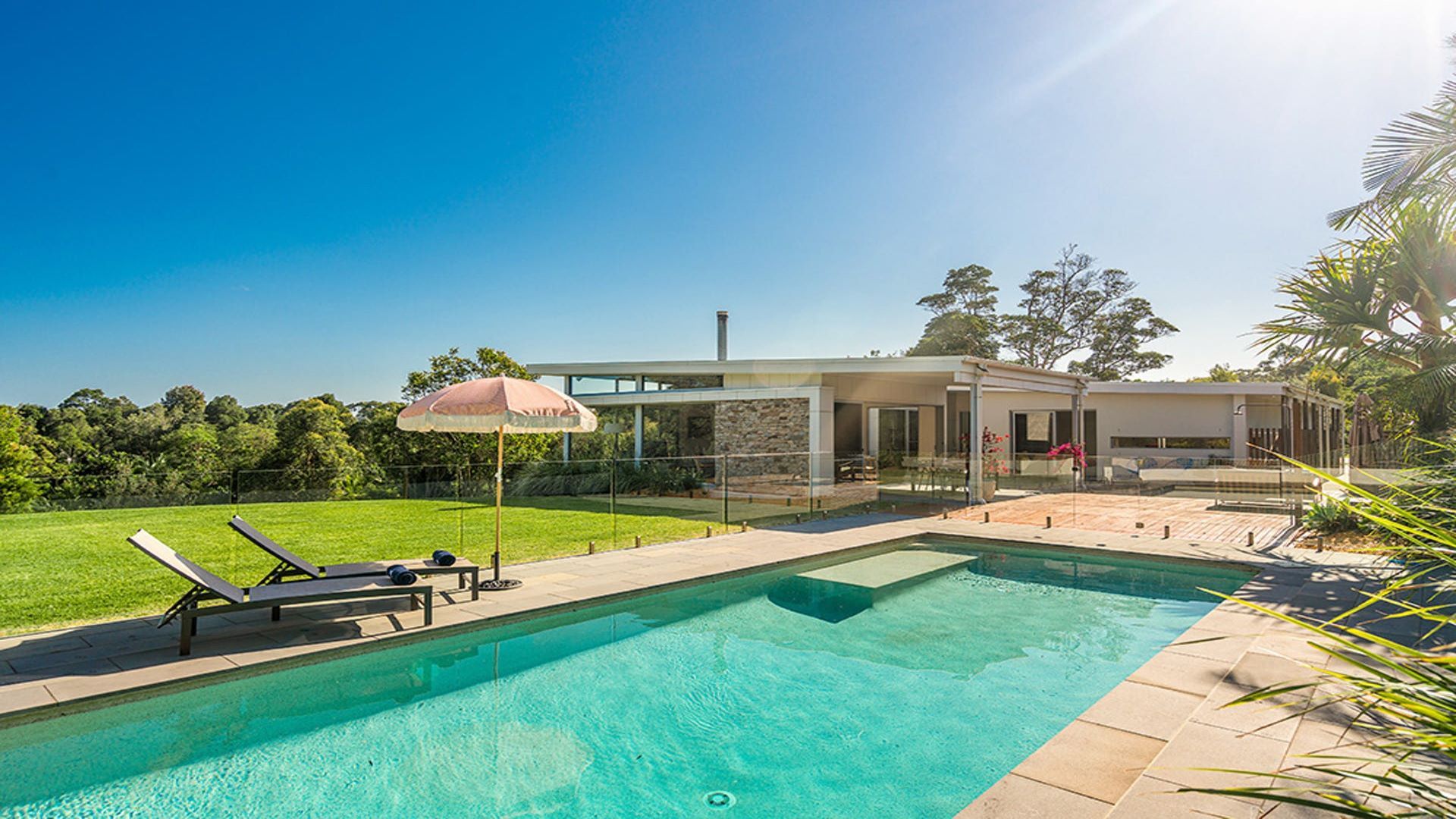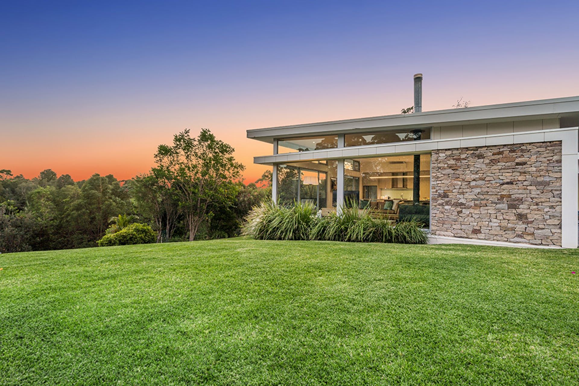 Escape the hustle of daily life and immerse yourself in nature's tranquility at Broken Ridge, where understated luxury meets mid-century modern design. Step through the impressive pivot door, nestled among sculptural plantings and a stunning stone and timber façade. The welcoming wide hallway, with its neutral palette and timber paneling, guides you into this remarkable home.