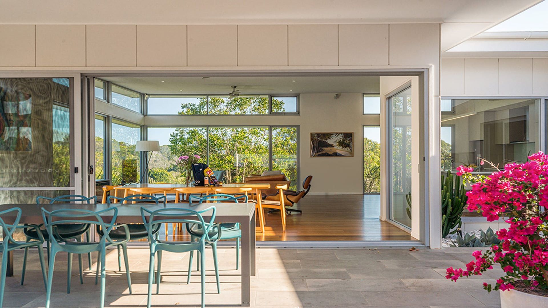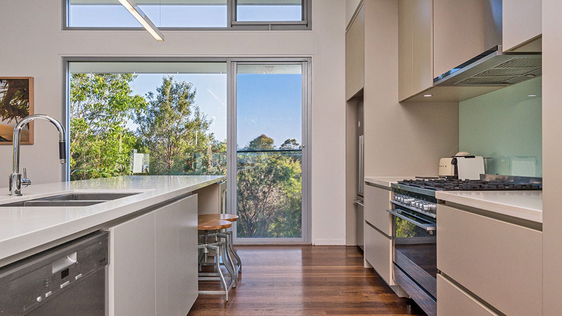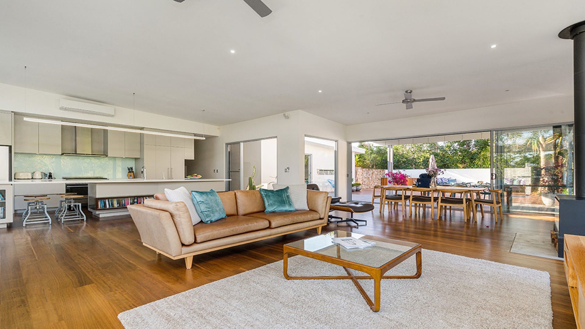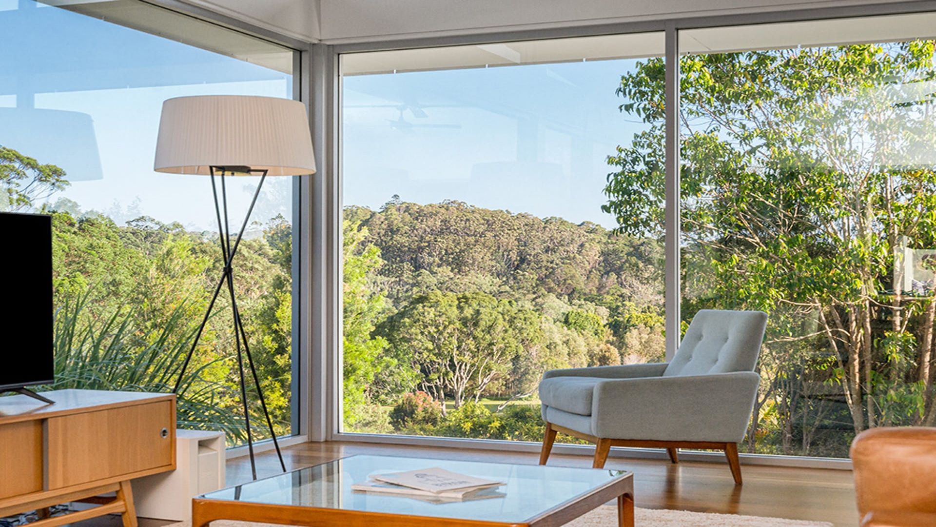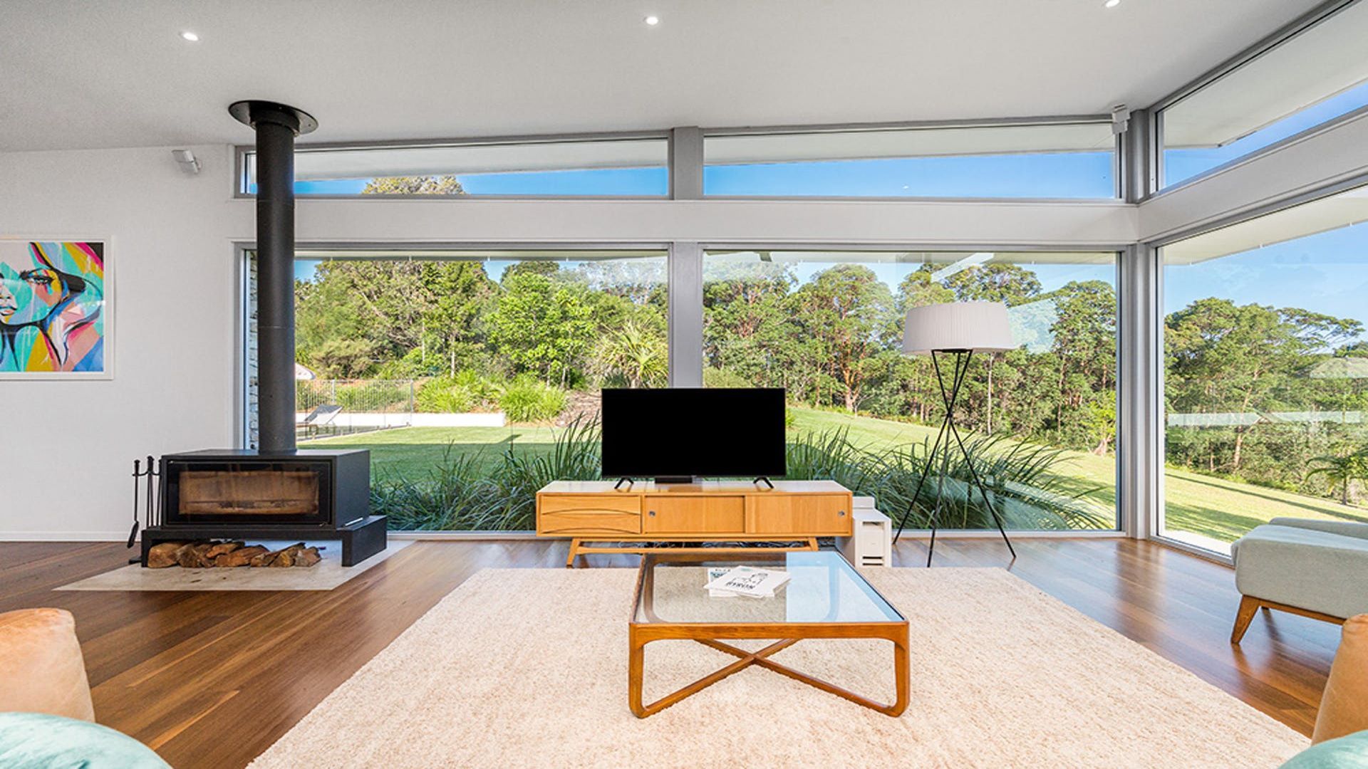 The open-plan living area bathes in natural light streaming through large sliding doors and walls of glazing, offering breathtaking views of lush greenery. The inviting kitchen showcases sandy-coloured cabinetry, a sophisticated glass splashback, and a statement island bench with comfortable seating. The adjacent living space provides multiple seating arrangements to enjoy the serene outlook throughout the day, complemented by a cosy fireplace for cooler evenings.