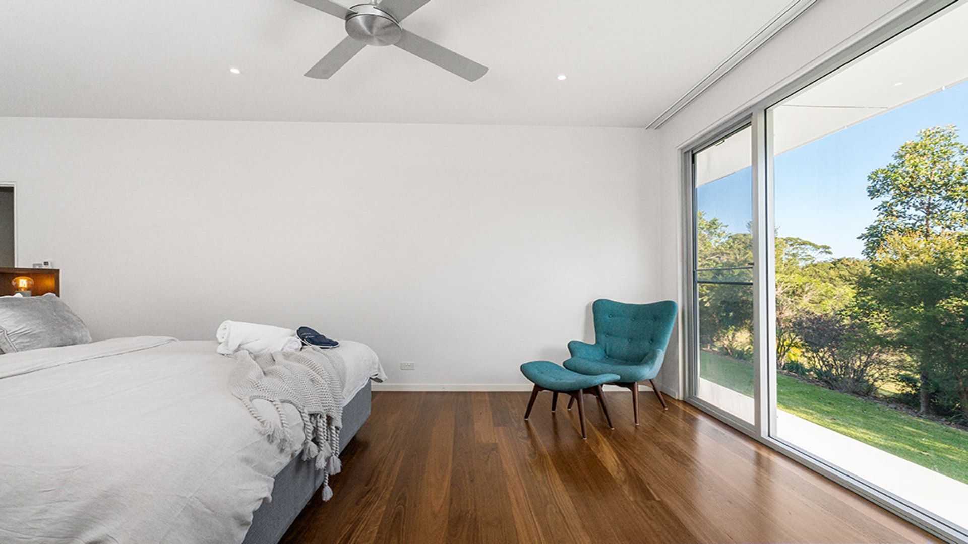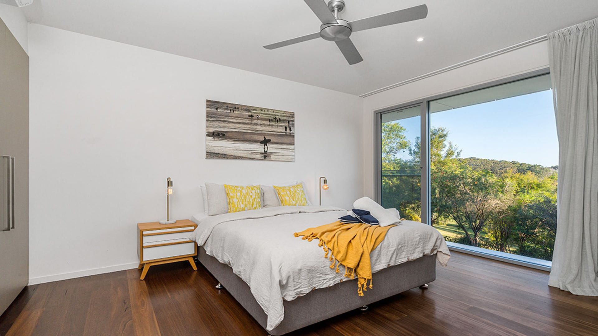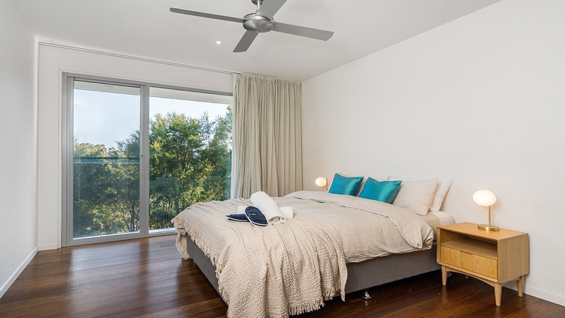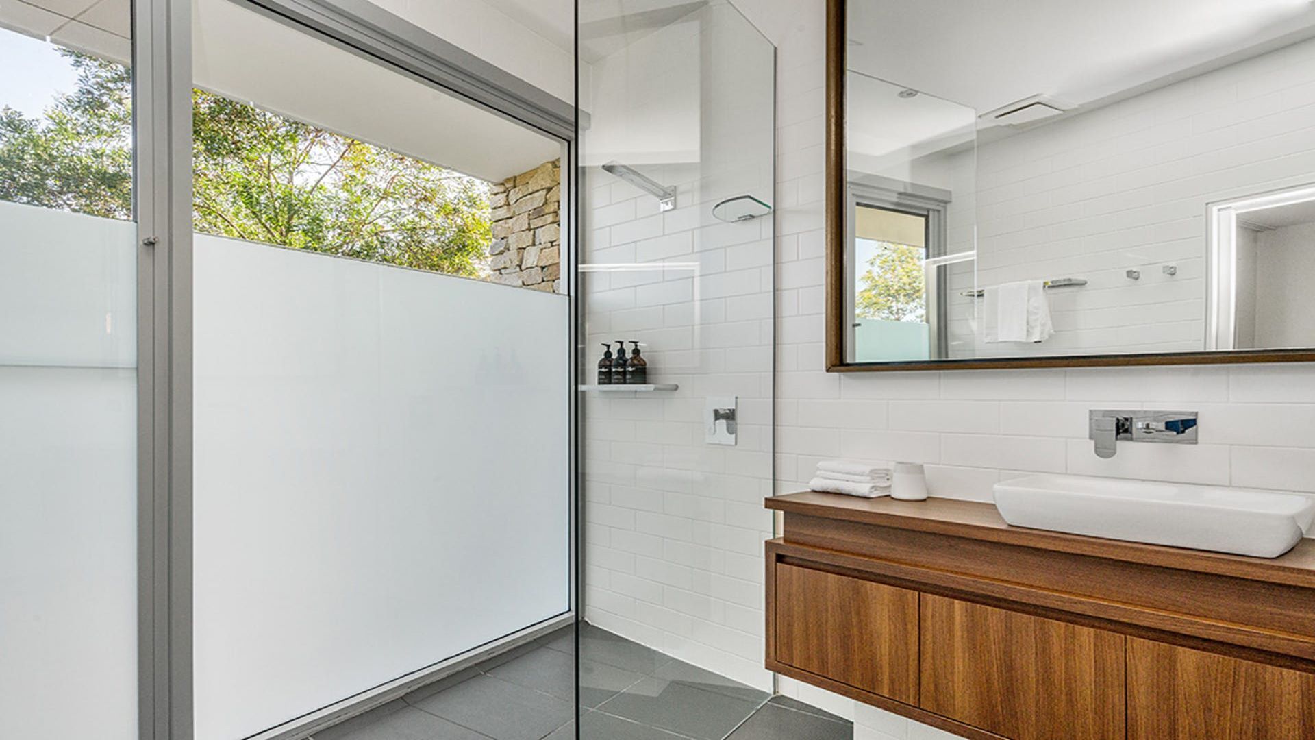 Tranquility extends to all 3 bedrooms. The main bedroom, positioned farthest from the living area, blends effortlessly with the natural surroundings. Its ensuite features a soothing combination of timber, white, and grey tones, elevated by a floor-to-ceiling window beside the shower for a touch of luxury. The family bathroom mirrors this calming palette with a shower and elegant freestanding bath. Two light-filled queen bedrooms flank the bathroom, while the rumpus room offers additional sleeping space with a double sofa bed.