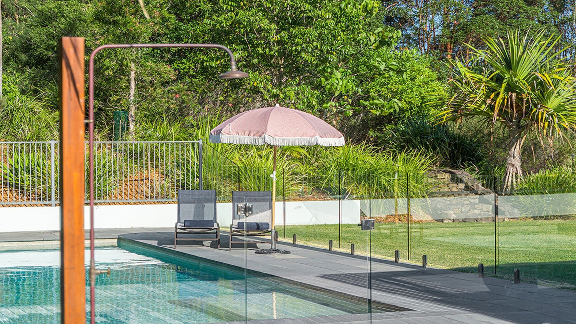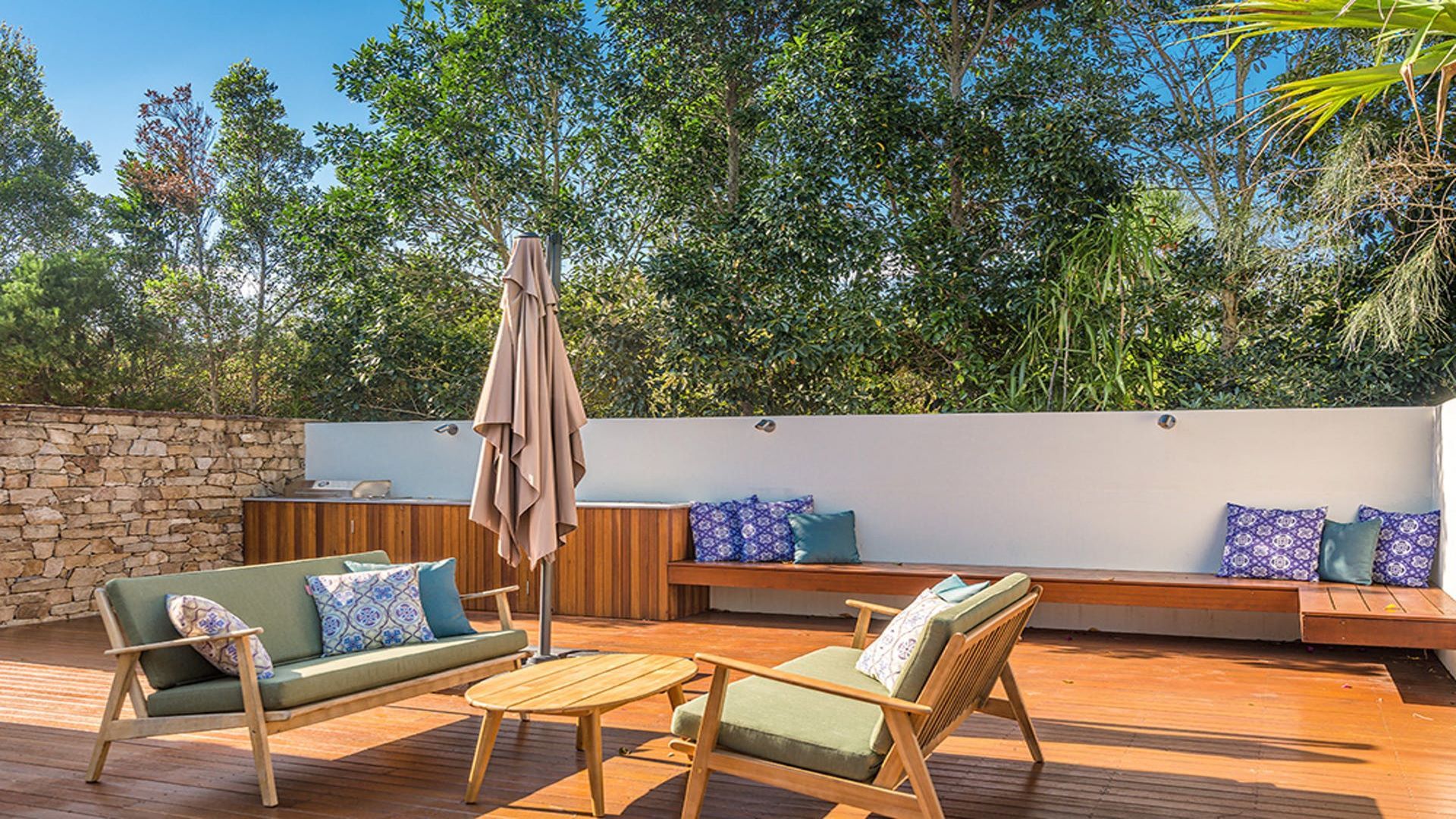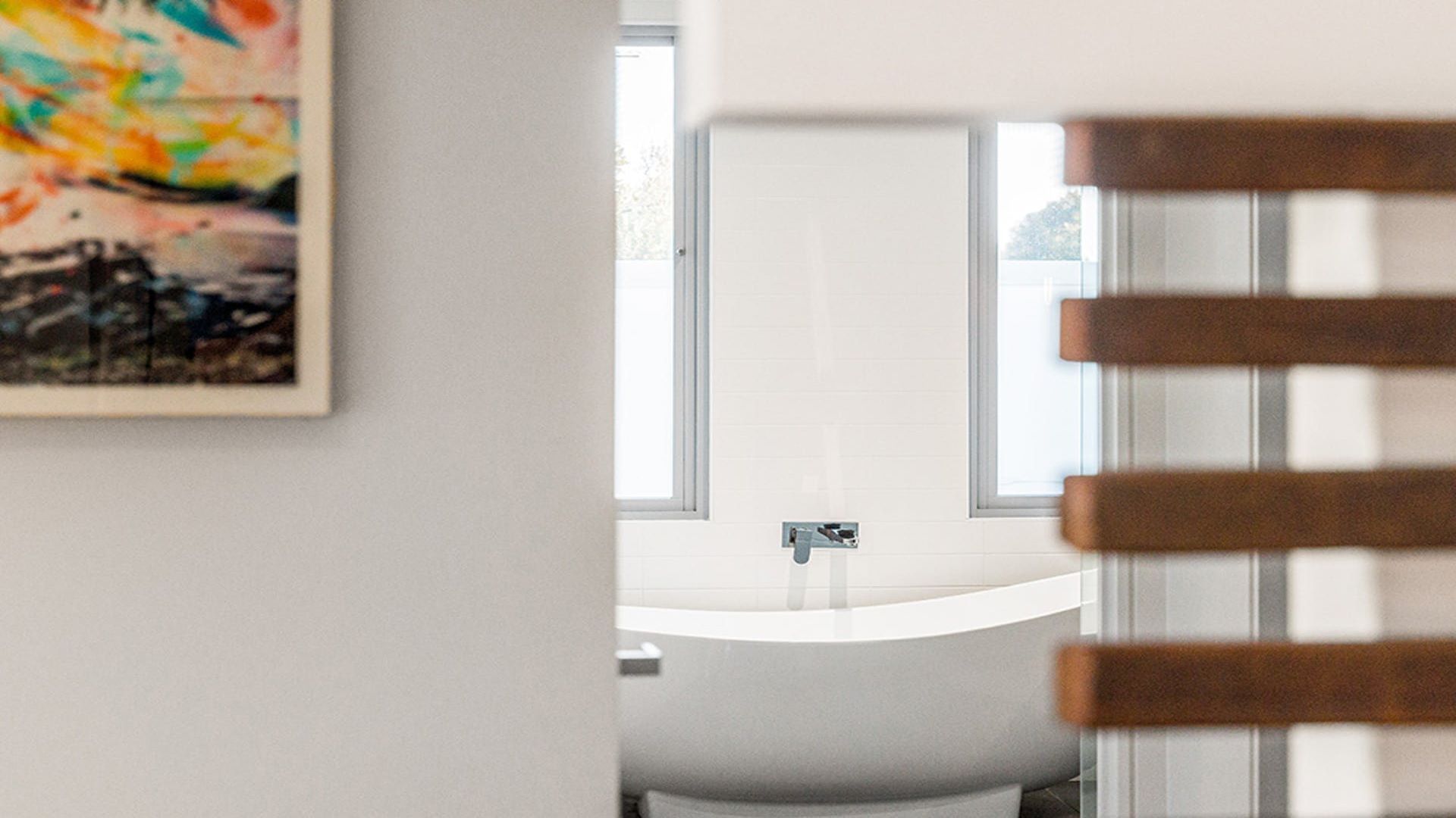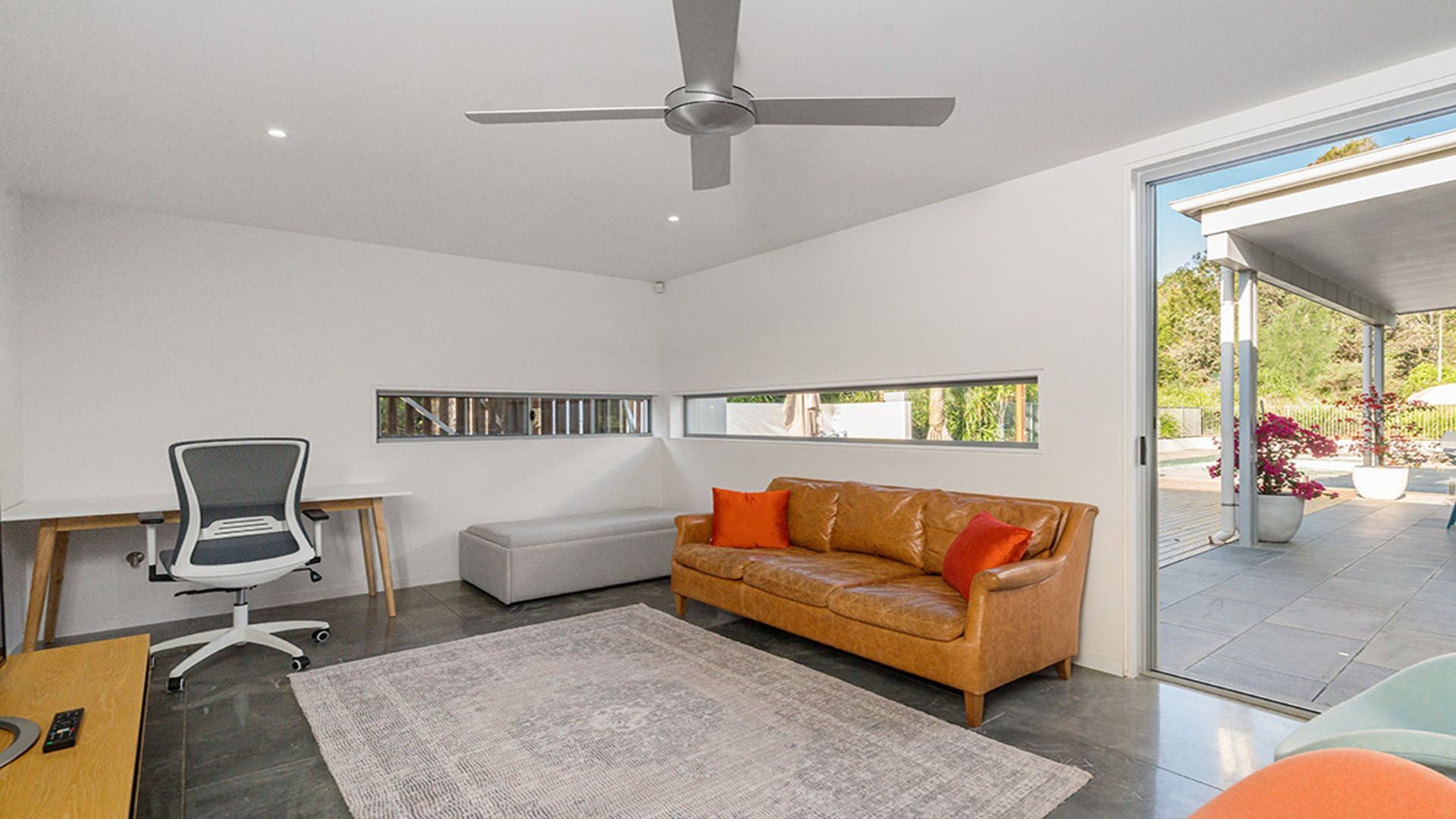 Tranquility extends to all 3 bedrooms. The main bedroom, positioned farthest from the living area, blends effortlessly with the natural surroundings. Its ensuite features a soothing combination of timber, white, and grey tones, elevated by a floor-to-ceiling window beside the shower for a touch of luxury. The family bathroom mirrors this calming palette with a shower and elegant freestanding bath. Two light-filled queen bedrooms flank the bathroom, while the rumpus room offers additional sleeping space with a double sofa bed.