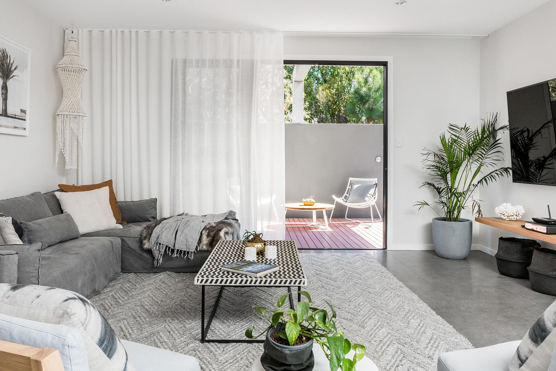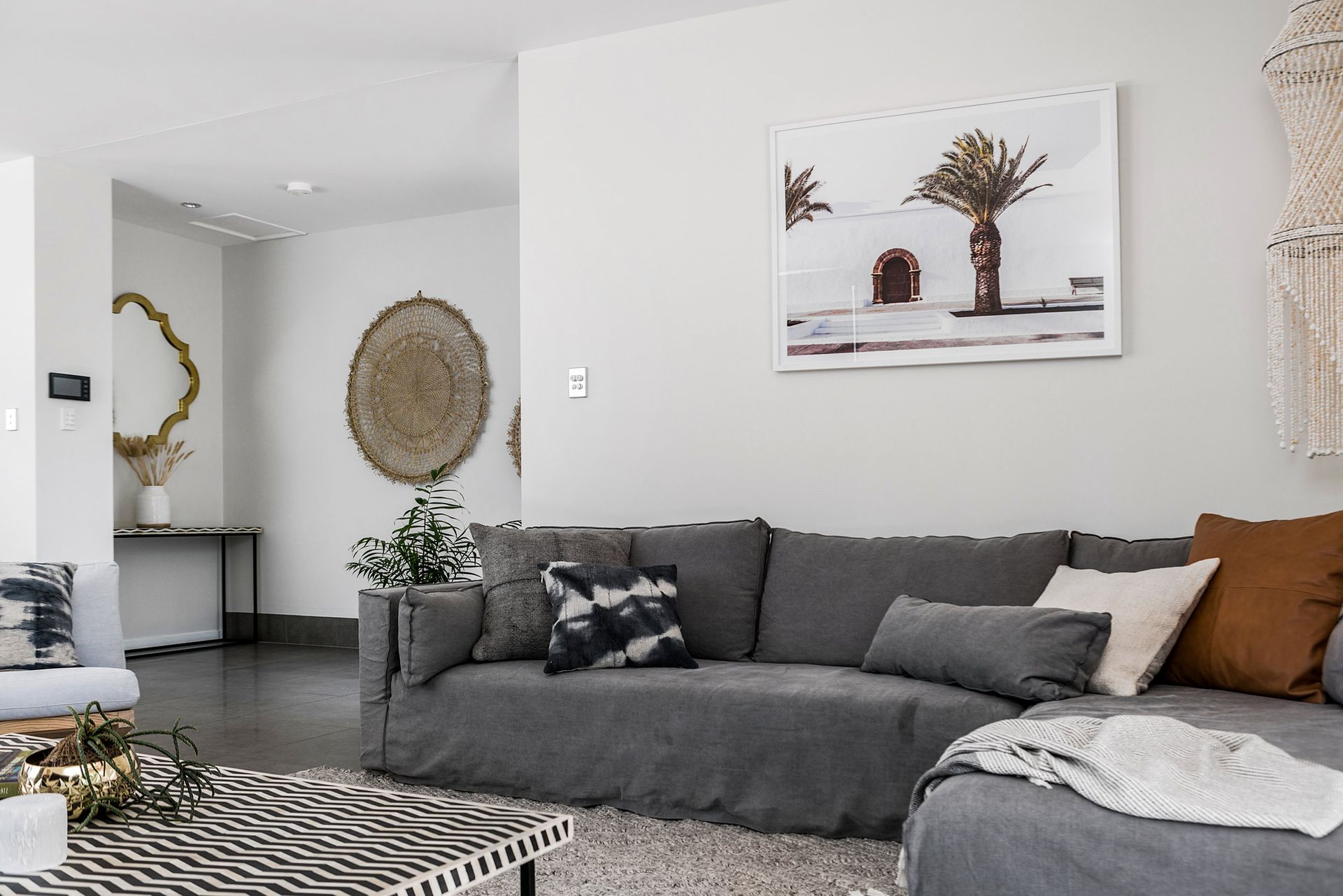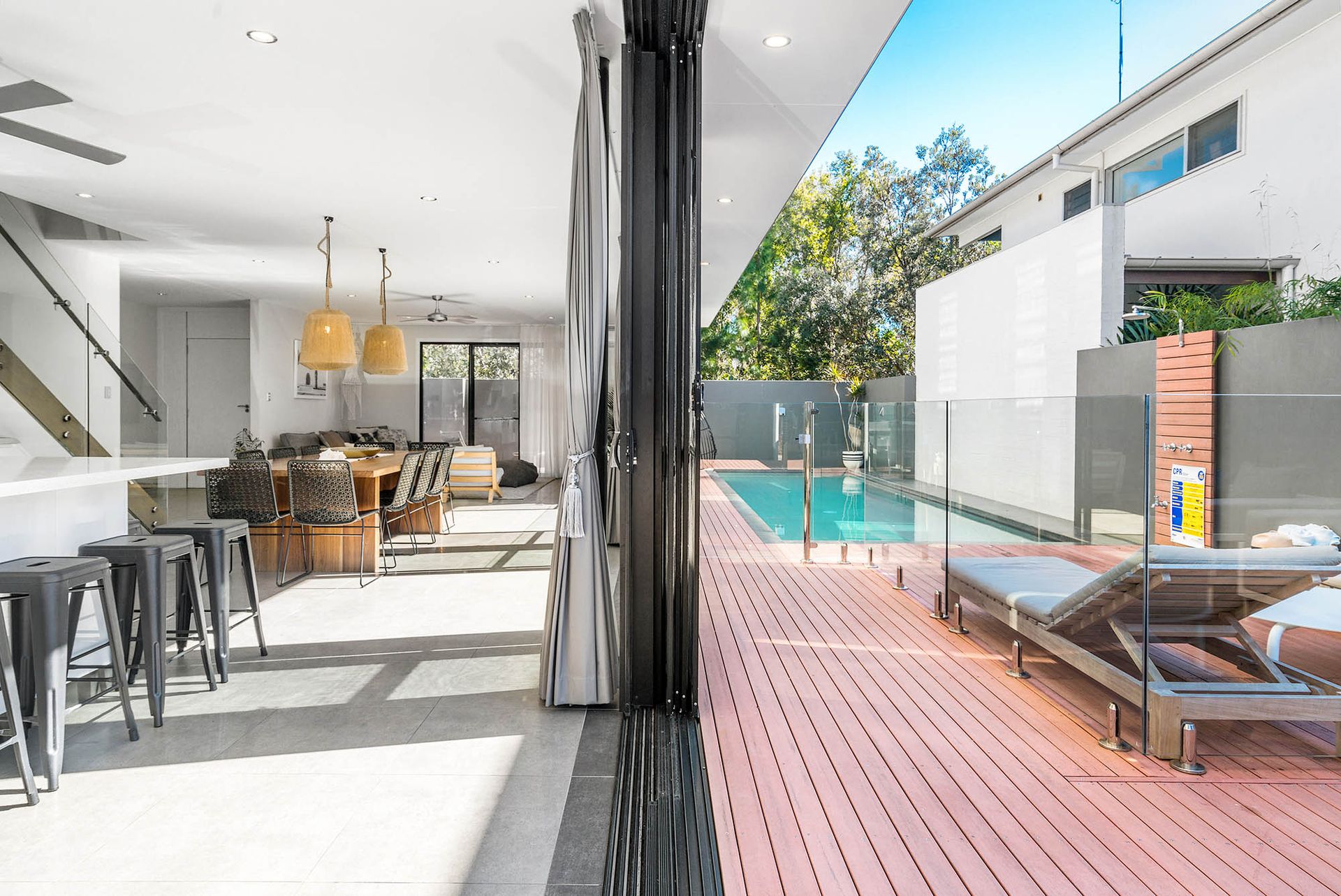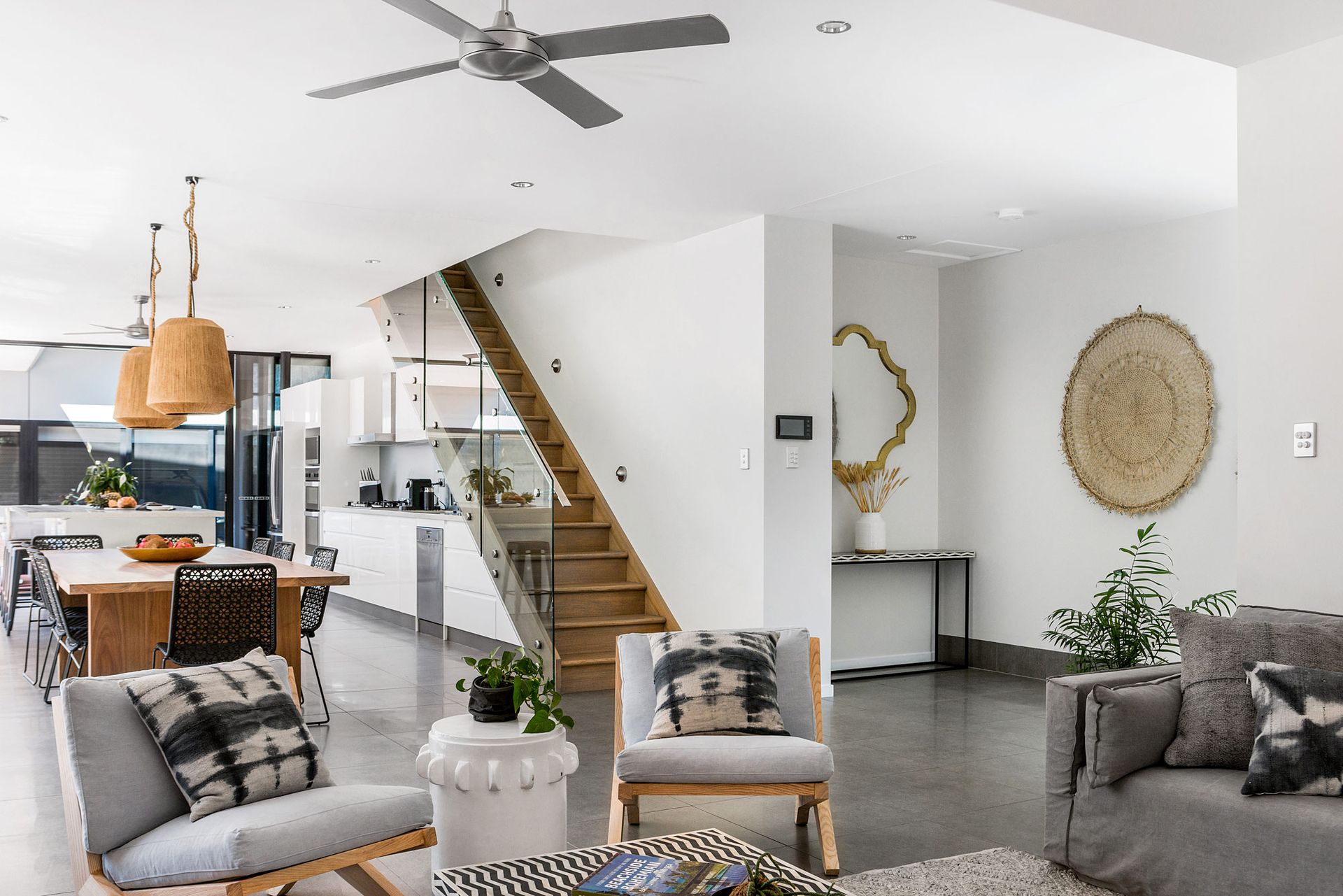 The polished concrete flooring creates a stylish foundation throughout the downstairs area, where three distinct zones flow together in a harmonious open-plan design for cooking, dining, and relaxing. The heart of the space features an inviting oversized sectional sofa – the perfect spot to gather for movie nights with complimentary Netflix or enjoy quality time with loved ones. Benefit from year-round comfort with reverse cycle air conditioning, while the expansive sliding glass doors invite the outside in, allowing cooling sea breezes to naturally ventilate the space.