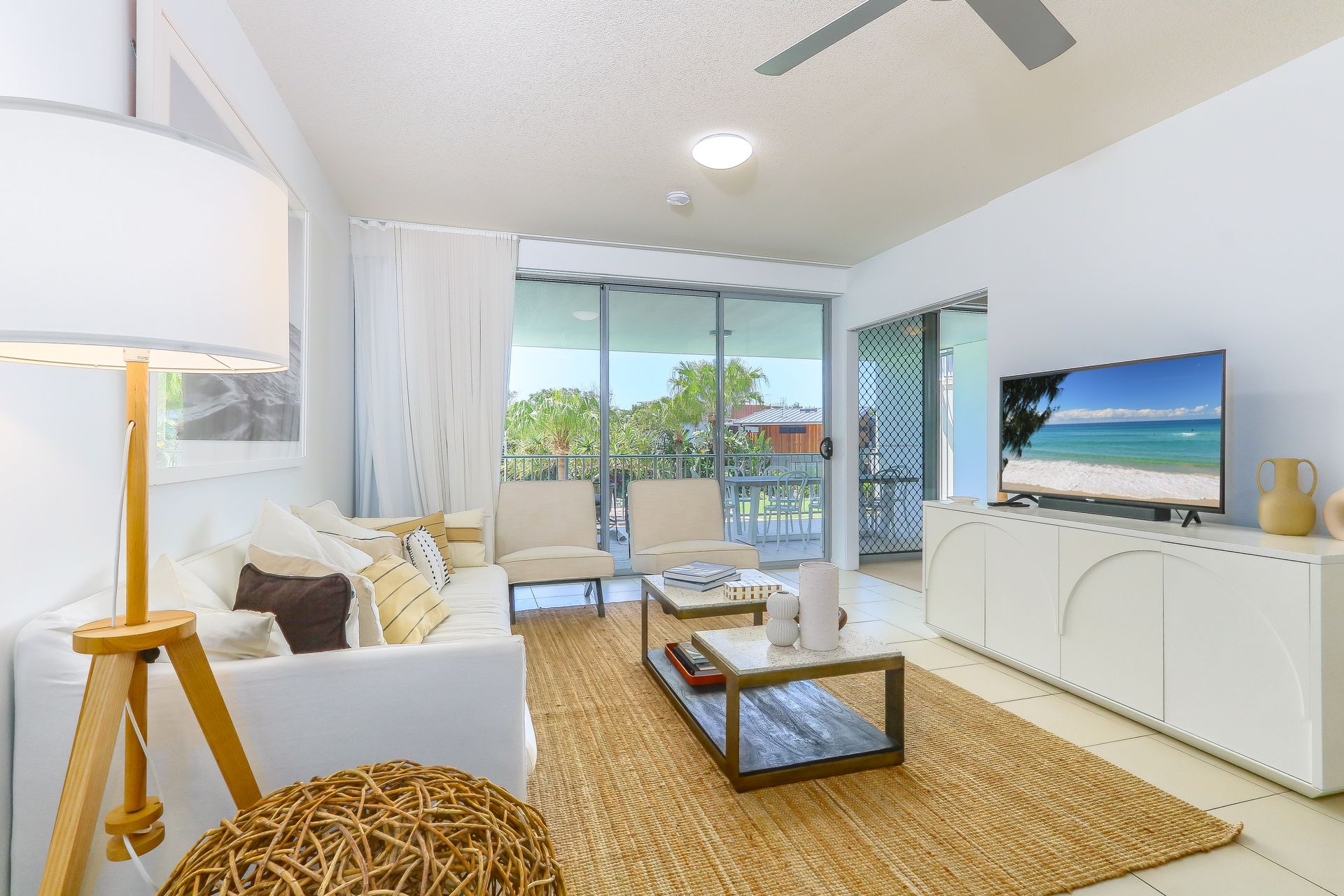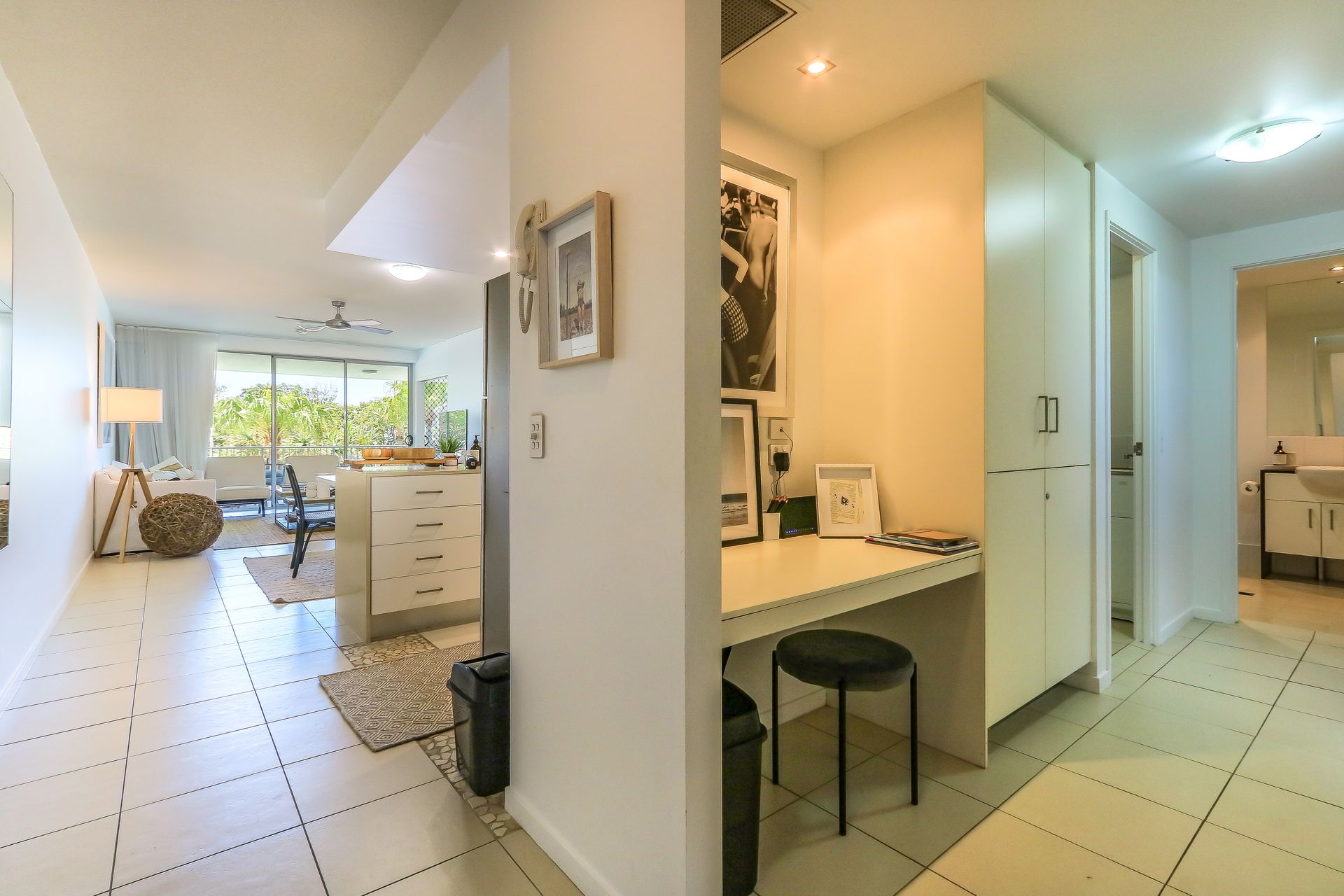 The well-designed interior features an open-plan living arrangement that connects smoothly to the airy balcony. The fully equipped kitchen makes holiday meals simple to prepare, while the comfortable living zone offers plenty of room for family time or peaceful relaxation. There's also a dedicated study nook ideal for reading or quiet moments.