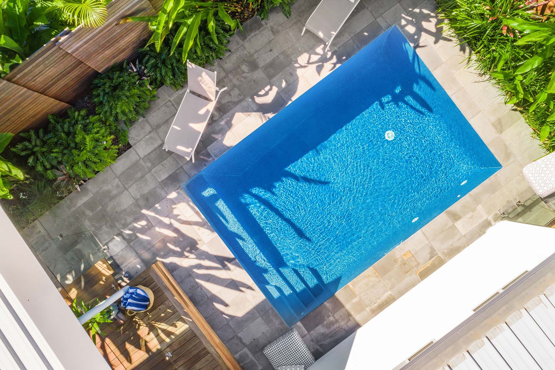 After experiencing the sand and surf at nearby Belongil Beach, cool off at home with a refreshing dip in your private swimming pool. Framed by palm leaves and sun loungers, this secluded pool oasis offers the perfect environment to relax and recharge in style.