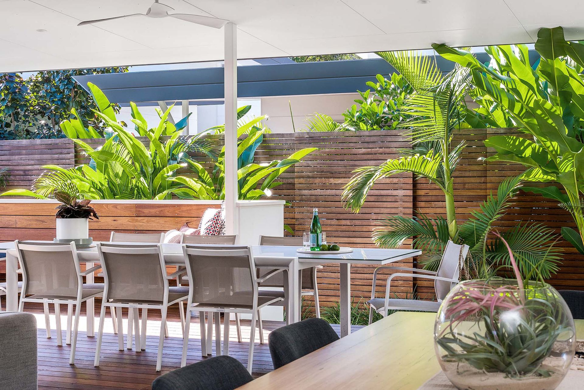 Entertain effortlessly at Kaylani Cove with seamless transition from indoor living to outdoor relaxation. The covered outdoor deck, accessible via sliding glass doors from the living room, features a spacious dining table, built-in outdoor grill, preparation space, and comfortable lounge seating. Surrounded by lush landscaping, this area provides the perfect setting for alfresco dining while enjoying Byron Bay's refreshing breezes.