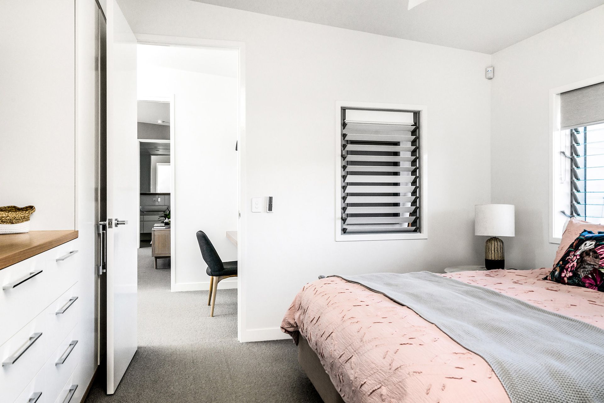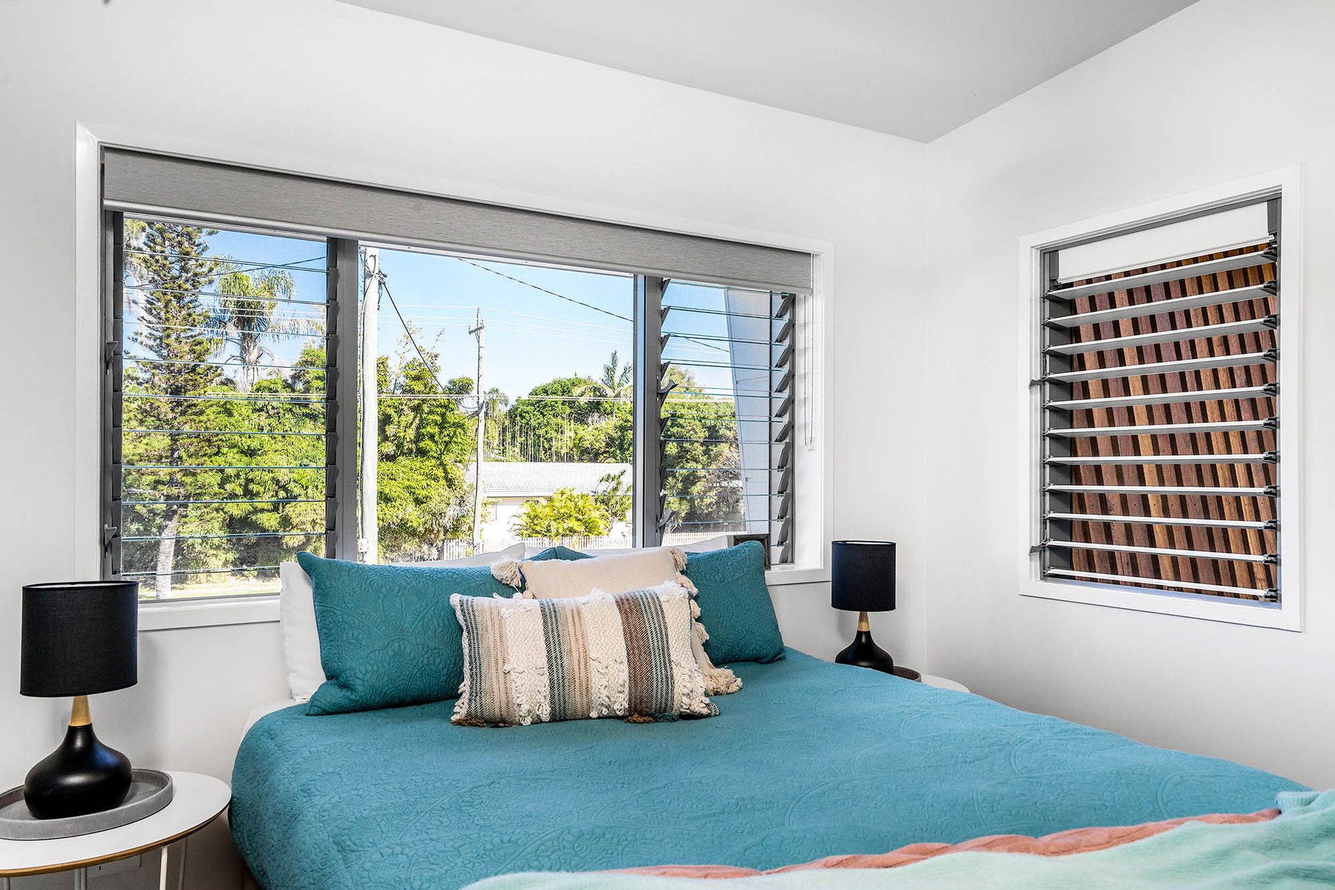 Most of Kaylani Cove's well-appointed bedrooms are located on the upper floor. The upstairs master bedroom features a king-sized bed, large HD TV, generous built-in wardrobe for storage, and a spacious ensuite bathroom with shower. A few steps higher reveals a charming, child-friendly bedroom hideaway with a single bed and trundle.