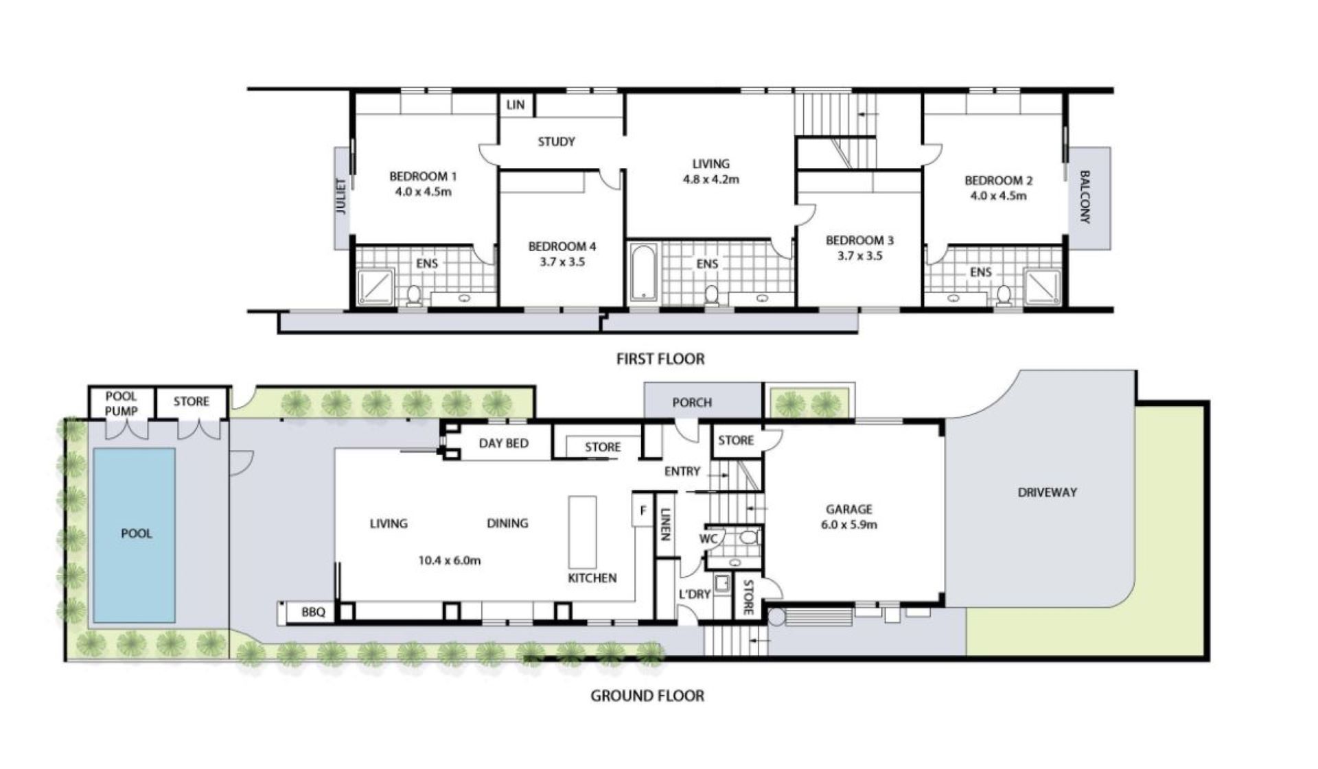 • 4 bedrooms, 4 bathrooms (2 ensuites, 1 shared bathroom, 1 powder room)