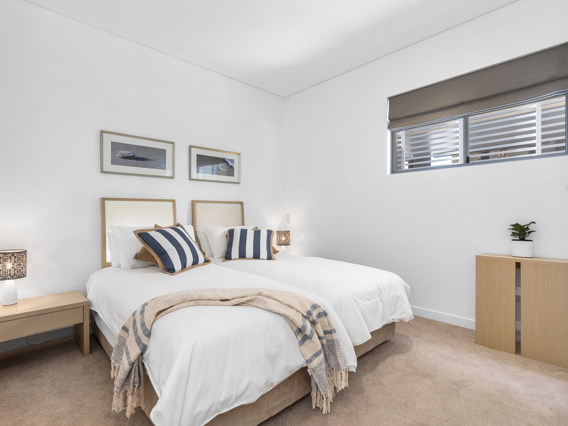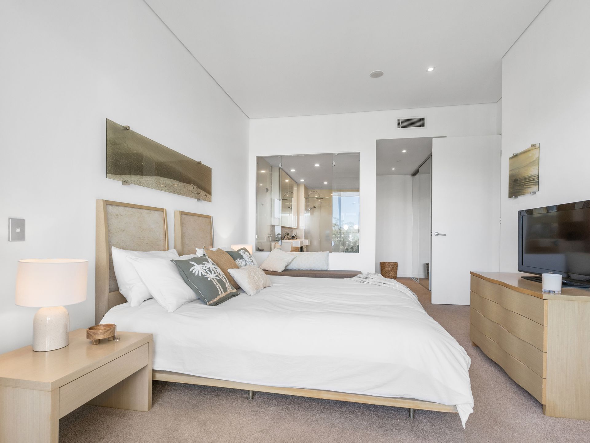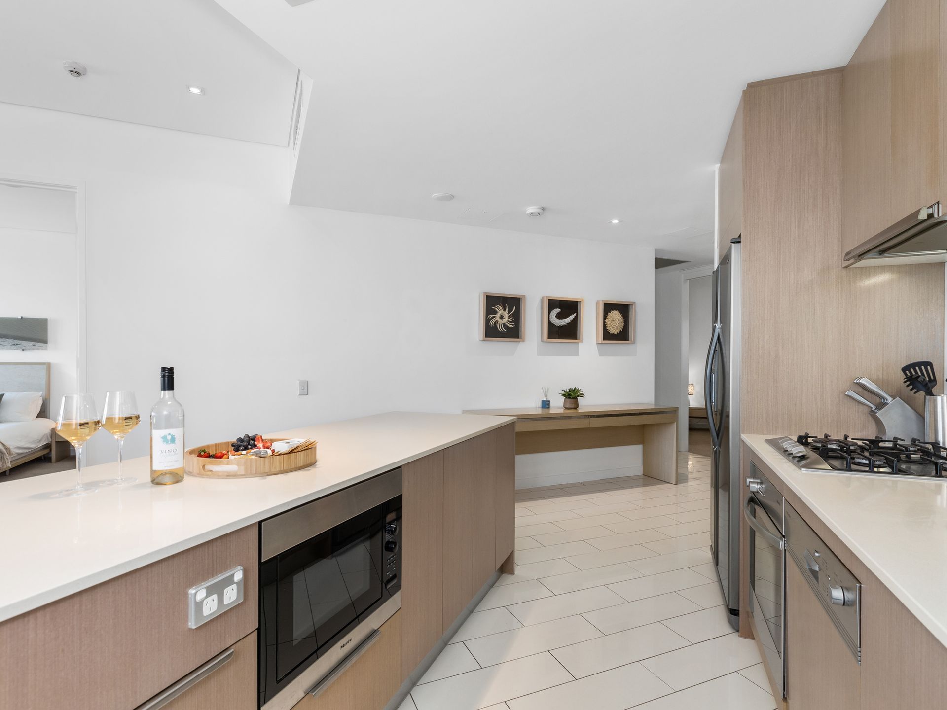 The master bedroom overlooks the lush parkland and features a sumptuous king bed and Smart TV, while the second bedroom offers adaptable king single beds with its own Smart TV. A dedicated study nook with a queen sofa bed accommodates additional guests (surcharge applies).