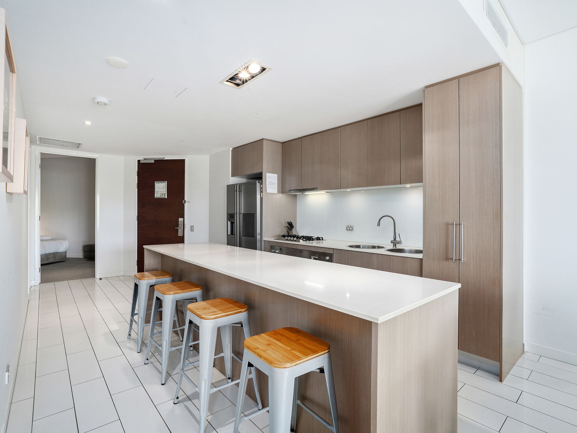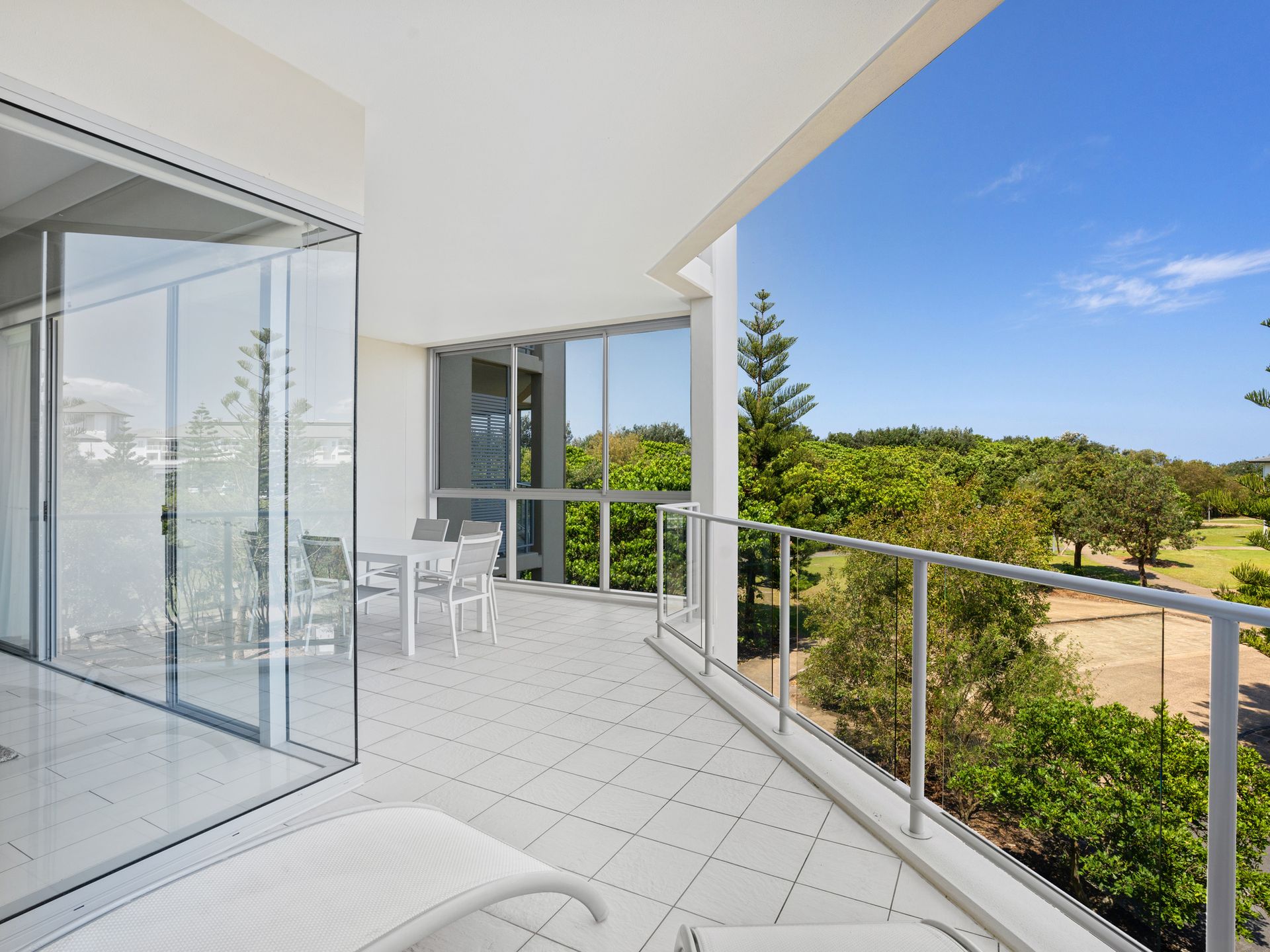 The spacious open-plan layout seamlessly connects living, dining and kitchen areas, creating an inviting atmosphere for relaxation and social gatherings. The sleek kitchen features a statement island bench, gas cooktop, and dedicated wine refrigerator—perfect for keeping your selected drops at the ideal temperature. Unwind in the contemporary lounge with entertainment on the 55" Samsung Smart TV, or step outside to your private balcony for al fresco dining overlooking tranquil parklands.