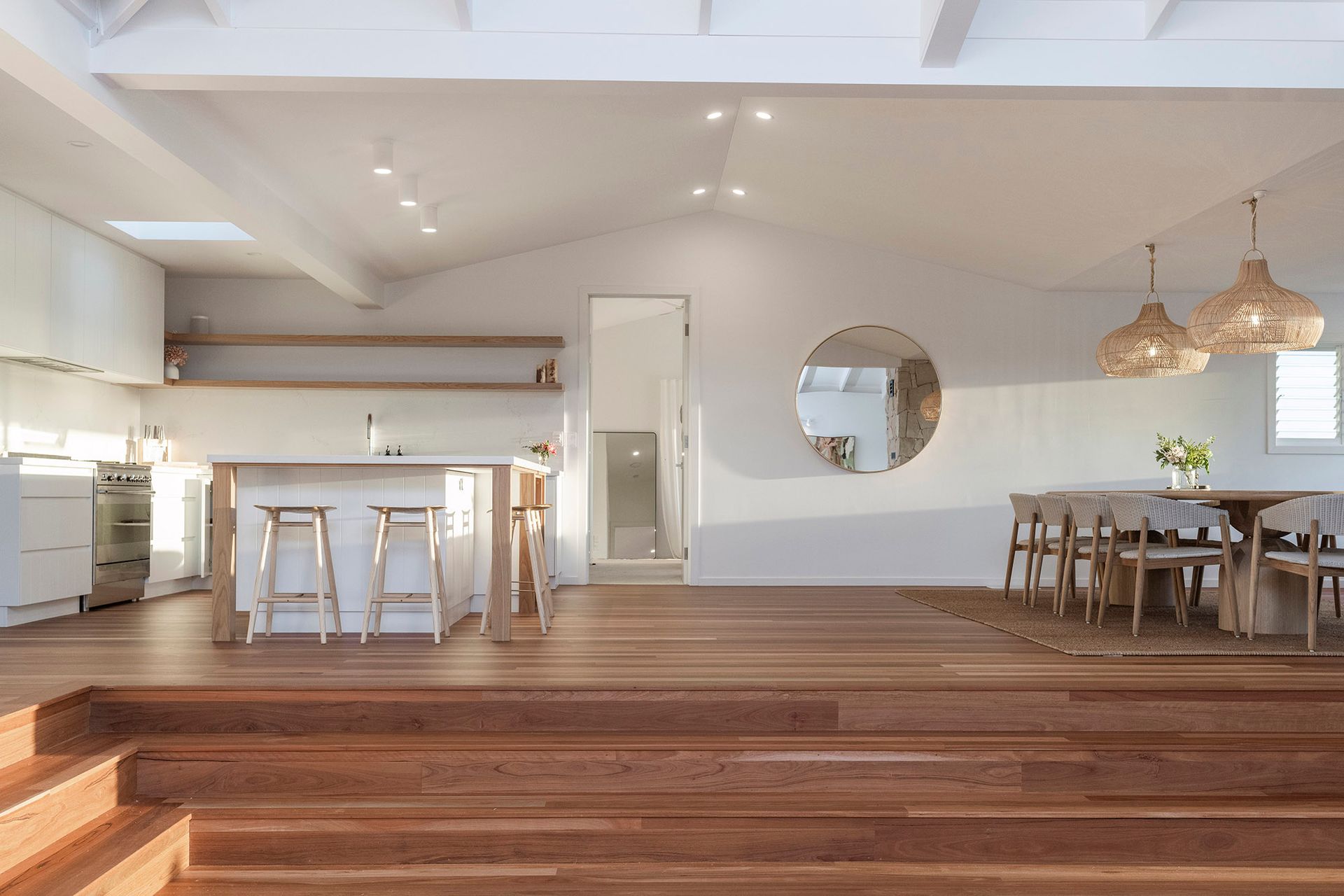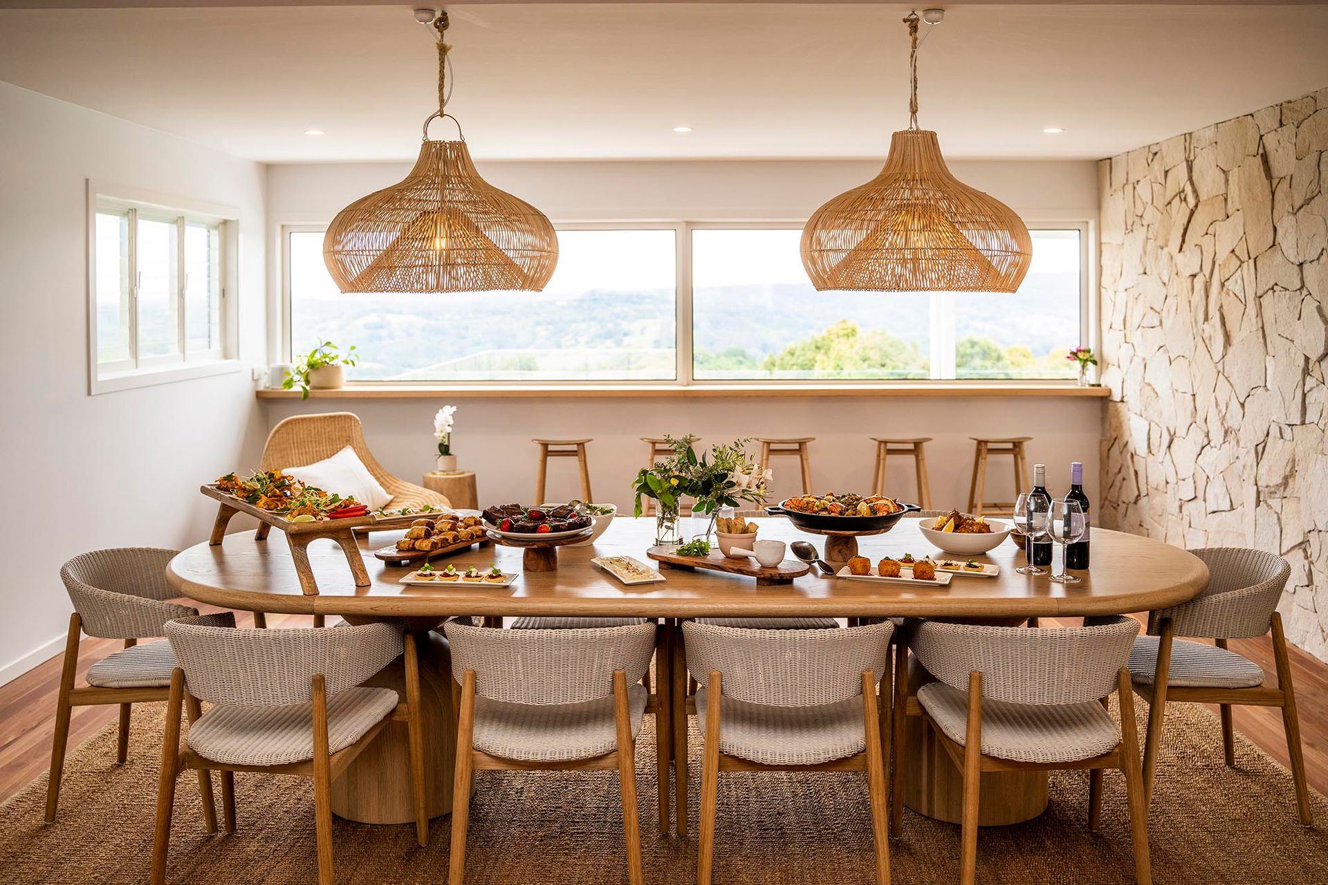 The interior features a stylish timber dining table with matching breakfast bar seating, offering multiple indoor dining options. Outside, an expansive dining setting on the verandah provides the ideal backdrop for long lunches or sunset drinks. A quality gas BBQ is also available for outdoor cooking.