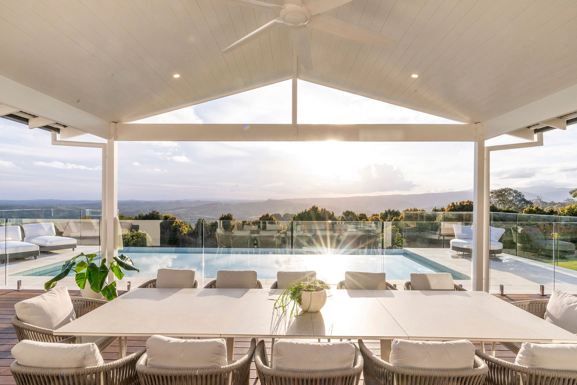 Miren Estate's glistening 10m infinity swimming pool (not heated) offers breathtaking views across rolling hills that stretch as far as the eye can see. This elevated retreat provides the perfect spot for cooling off, with comfortable sun loungers and outdoor seating available on the verandah, complemented by a retractable shade awning for sun protection.