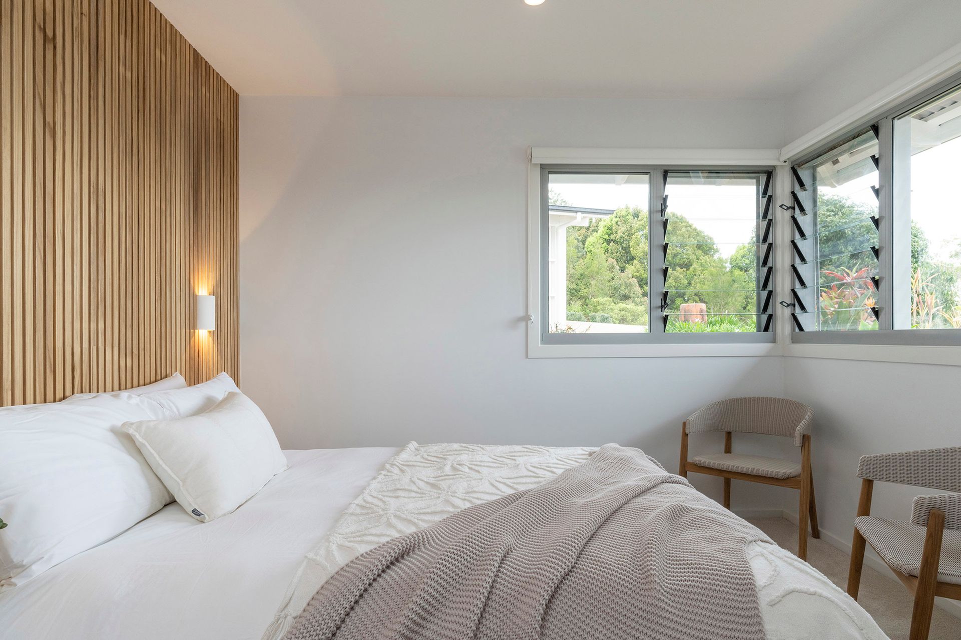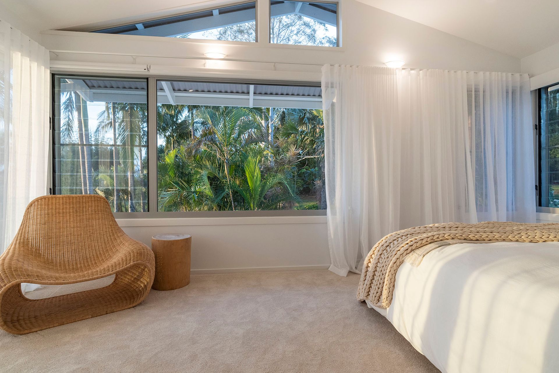 Prepare to be enchanted by Miren Estate's striking main bedroom, embodying luxury and beauty. Positioned in a separate wing, this delightful space features a super king bed, sleek ensuite bathroom, and enormous walk-in wardrobe. It opens onto a private section of the verandah, where a beautiful rocking chair invites guests to gaze across the serene hinterland vista.