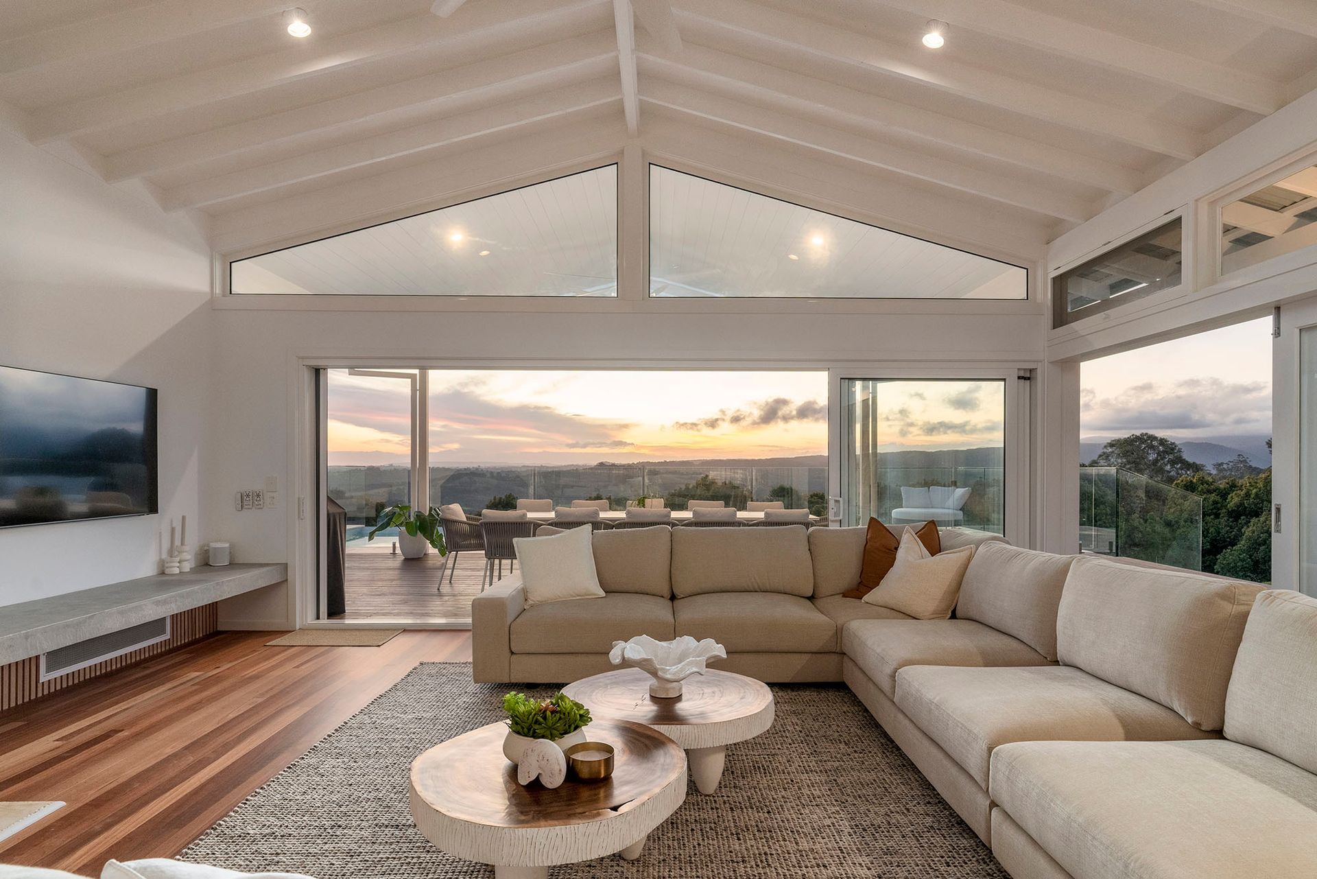 Miren Estate's welcoming living area creates the perfect gathering space for family and friends to unwind in supreme comfort. Designed with bi-fold doors opening onto the verandah and gardens, this delightful space features a generous 10-seat lounge suite and eye-catching wood fireplace that creates a cosy atmosphere during cooler months. Designer chairs and custom artwork complete the space, delivering a sophisticated yet relaxed ambiance.