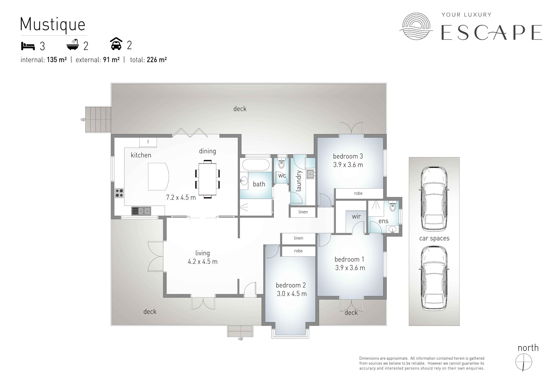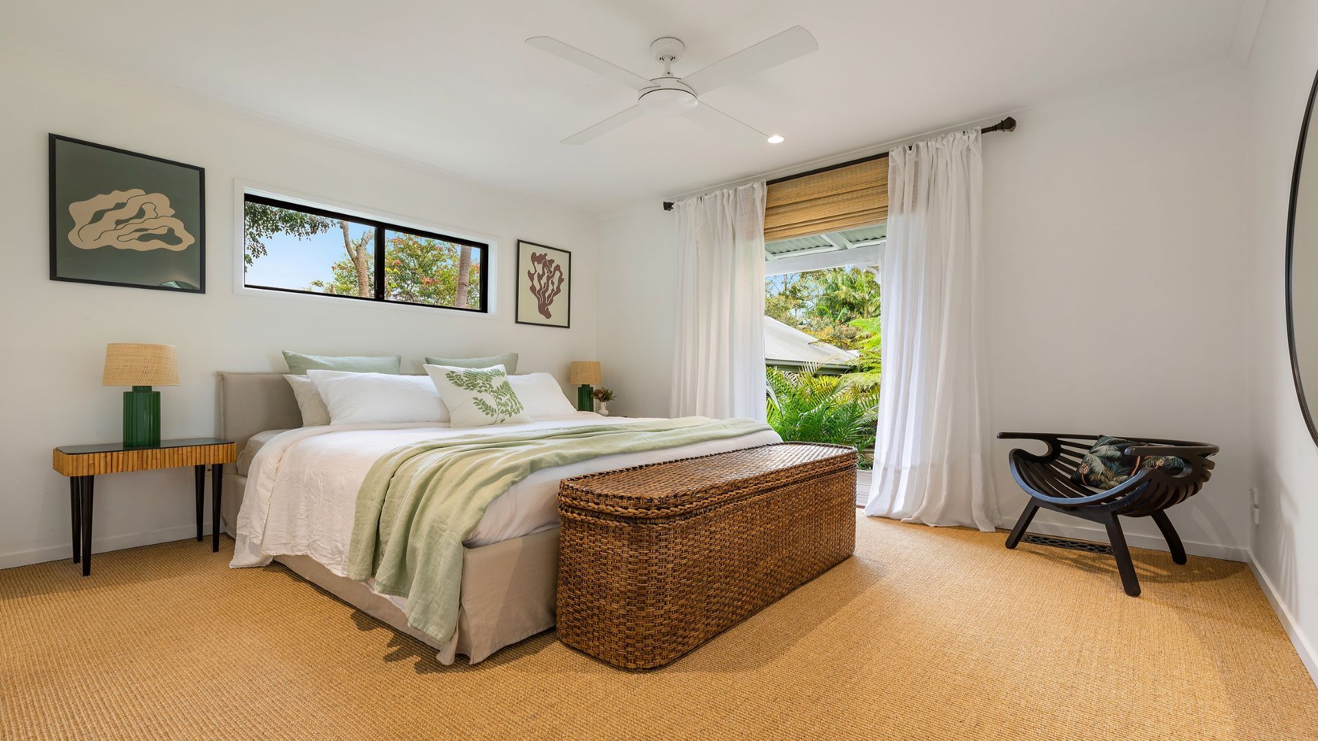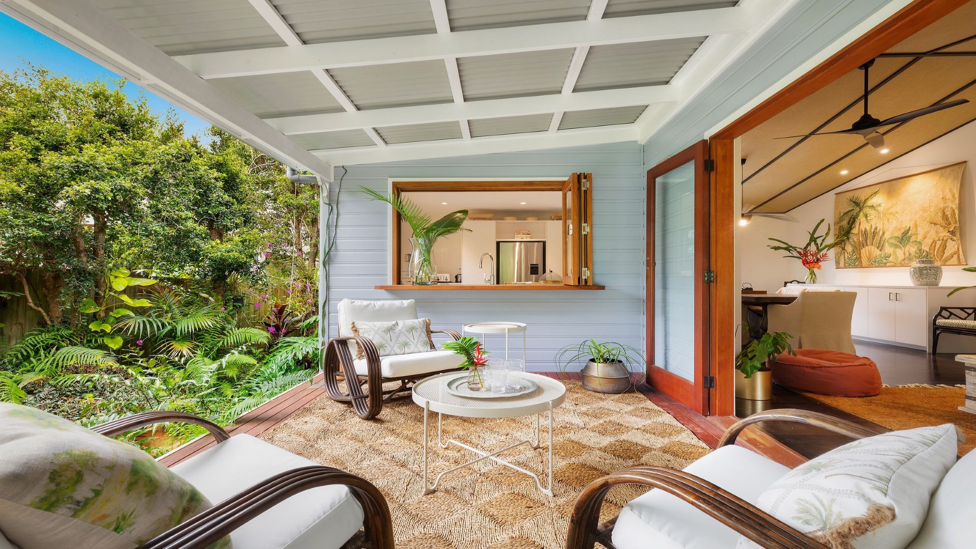 Accommodating up to 6 guests, the living and sleeping quarters open onto spacious alfresco decks—integrating the lush gardens with interior spaces. The central living and dining area showcases a striking pitched rattan-lined ceiling, complemented by a fully equipped gourmet kitchen, 2 bathrooms, and parking for 2 vehicles.