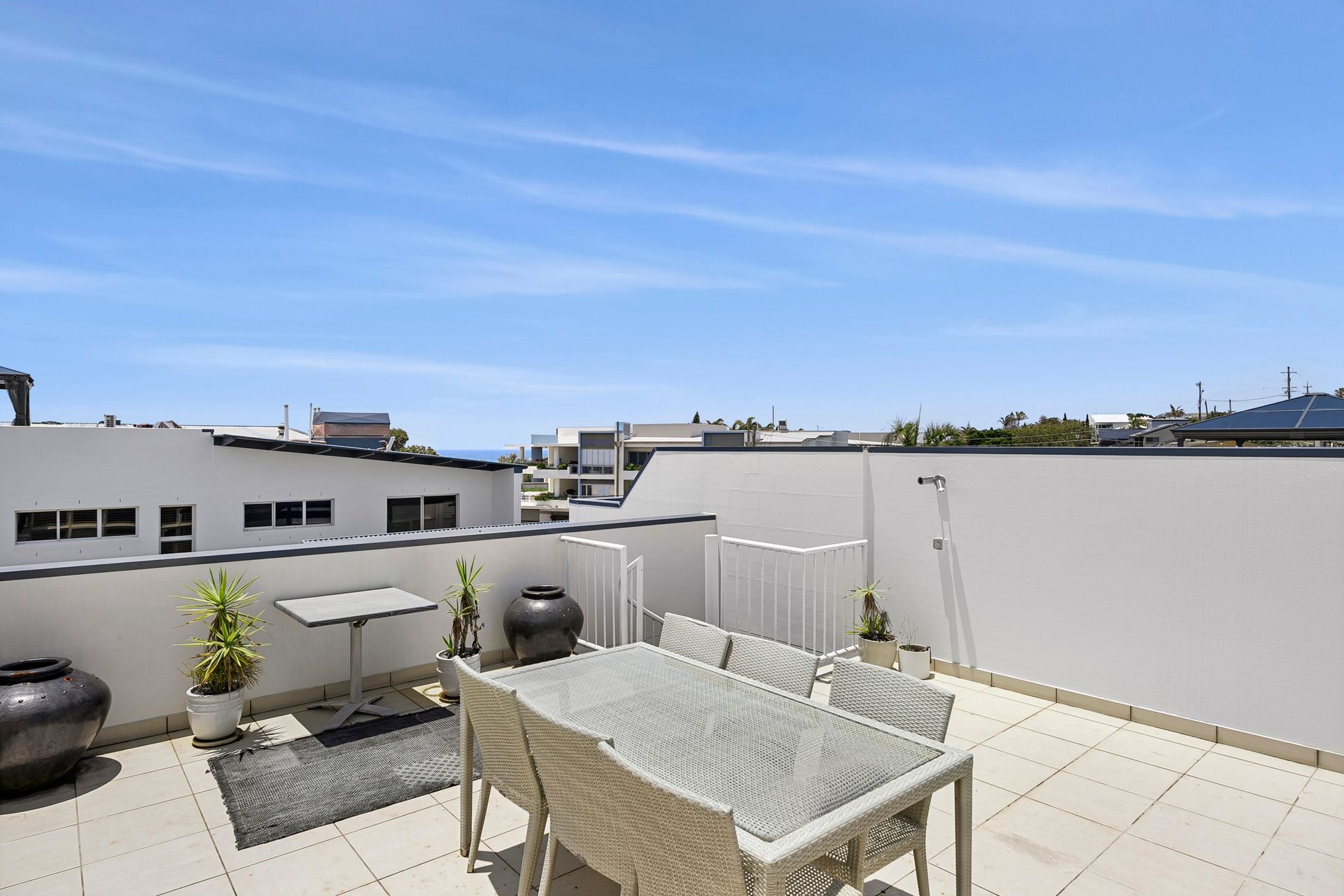 The apartment's standout feature is its exclusive rooftop terrace, accessible via a private stairway. This spectacular outdoor space offers sweeping views across Kingscliff township and the picturesque hinterland—ideal for alfresco dining, evening drinks, or simply unwinding in the refreshing sea breeze.
