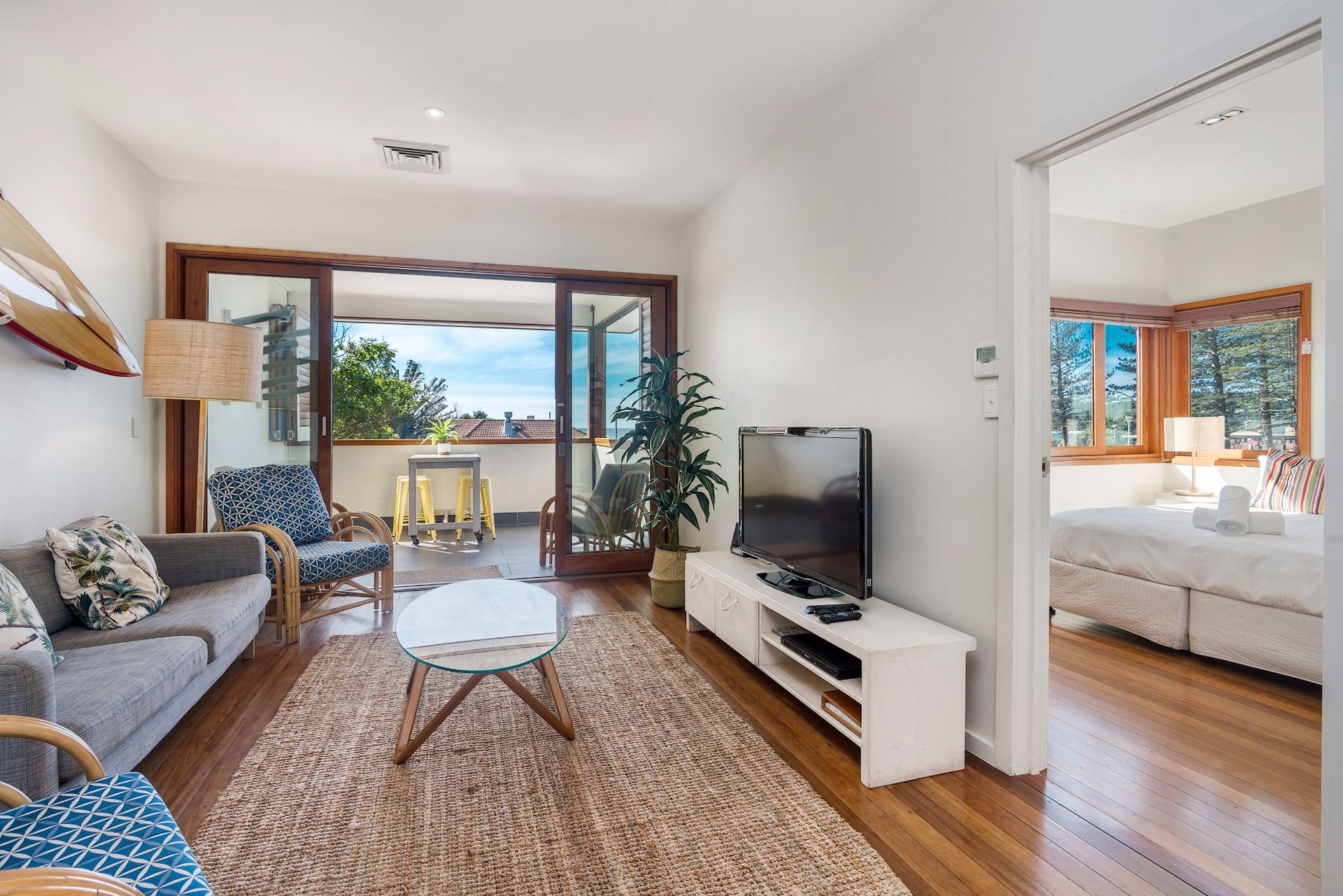 Quiksilver Apartments offers a spacious open-plan living and dining area, featuring a modern sofa and armchairs, surf art and flat-screen TV. There's a small timber bench-style dining setting for meals and timber-framed doors opening to reveal the covered outdoor space and stunning ocean views.