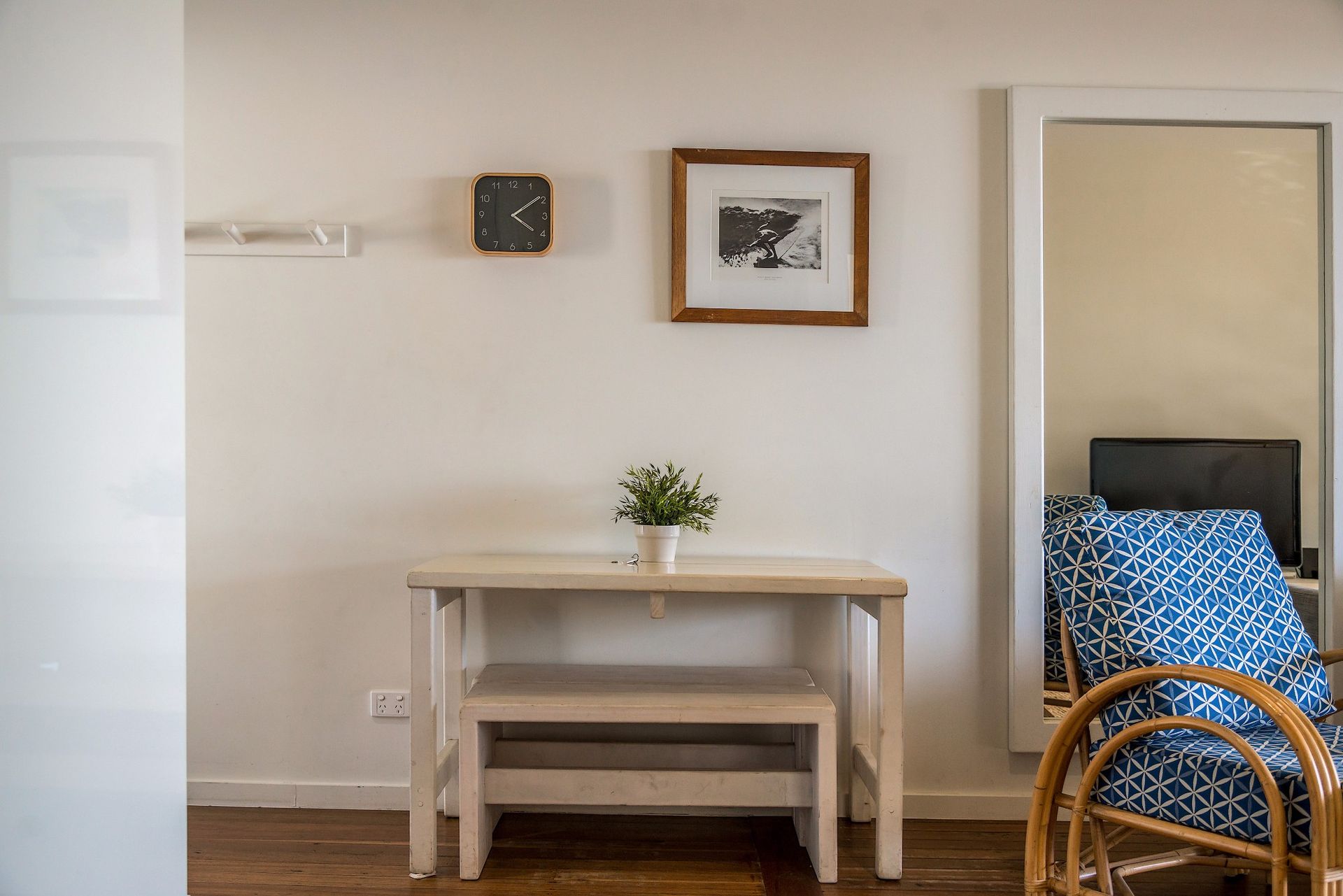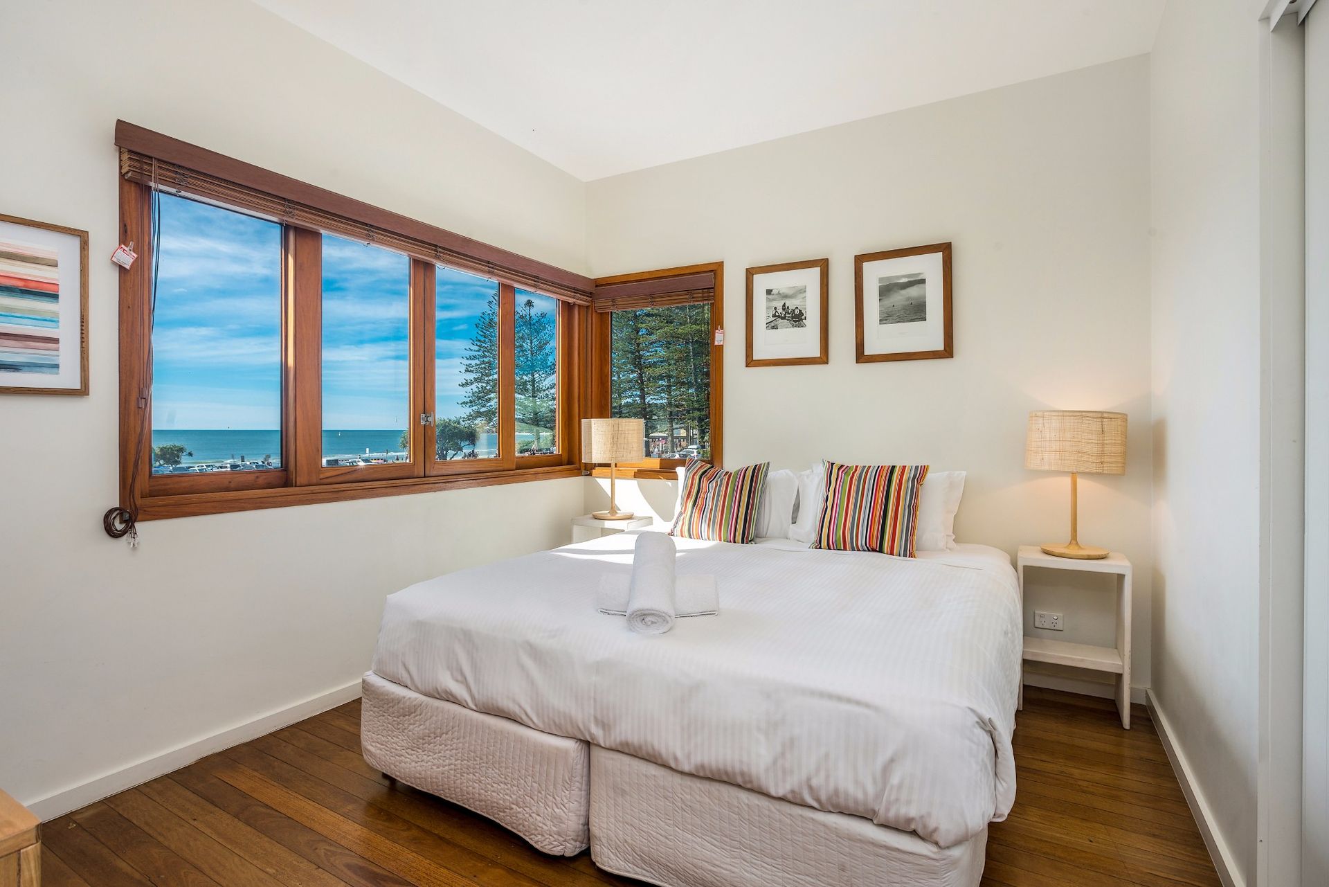 Sleep easy in the two spacious bedrooms at Quiksilver Apartments, with simple white interiors and timber-framed windows opening to welcome sea breezes and the sounds of the ocean.