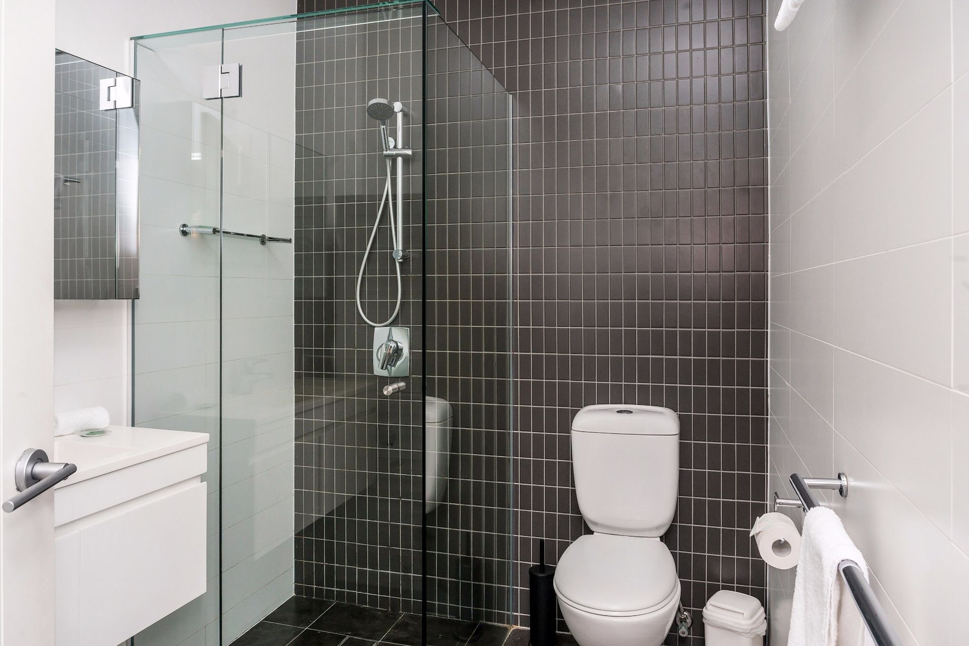 A simple, stylish bathroom-laundry combination features frameless glass shower, floating vanity, toilet, washing machine and dryer.