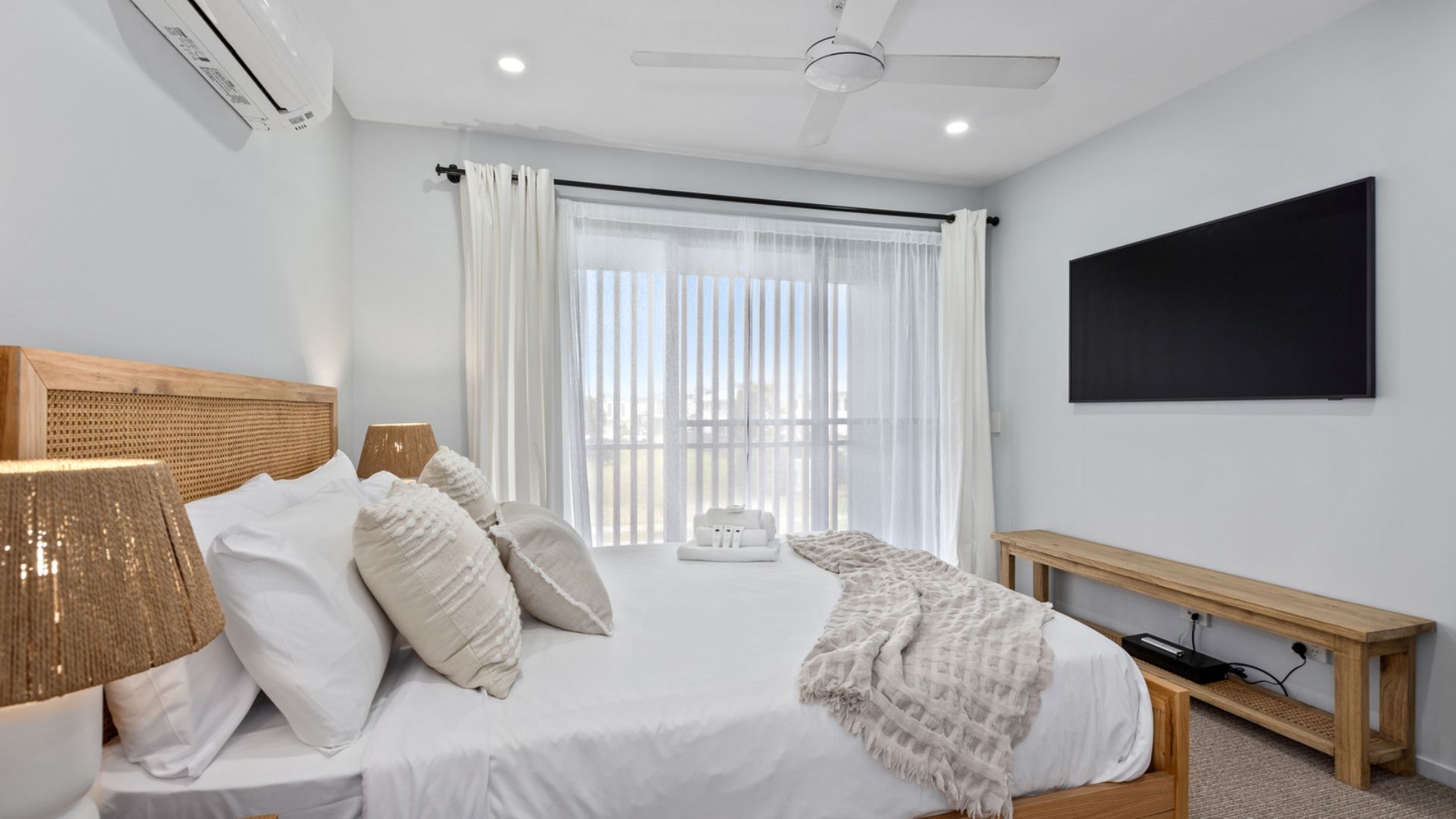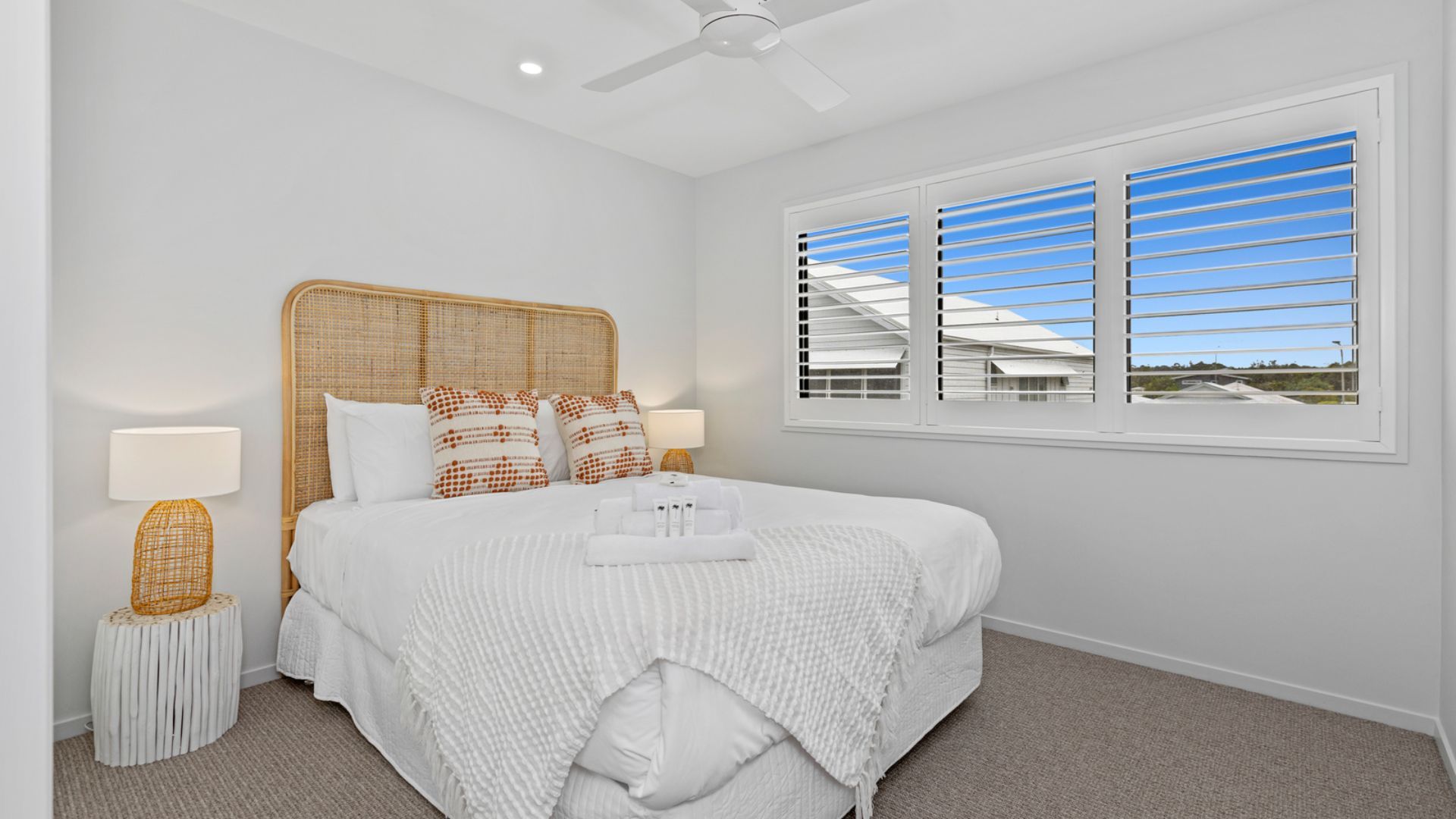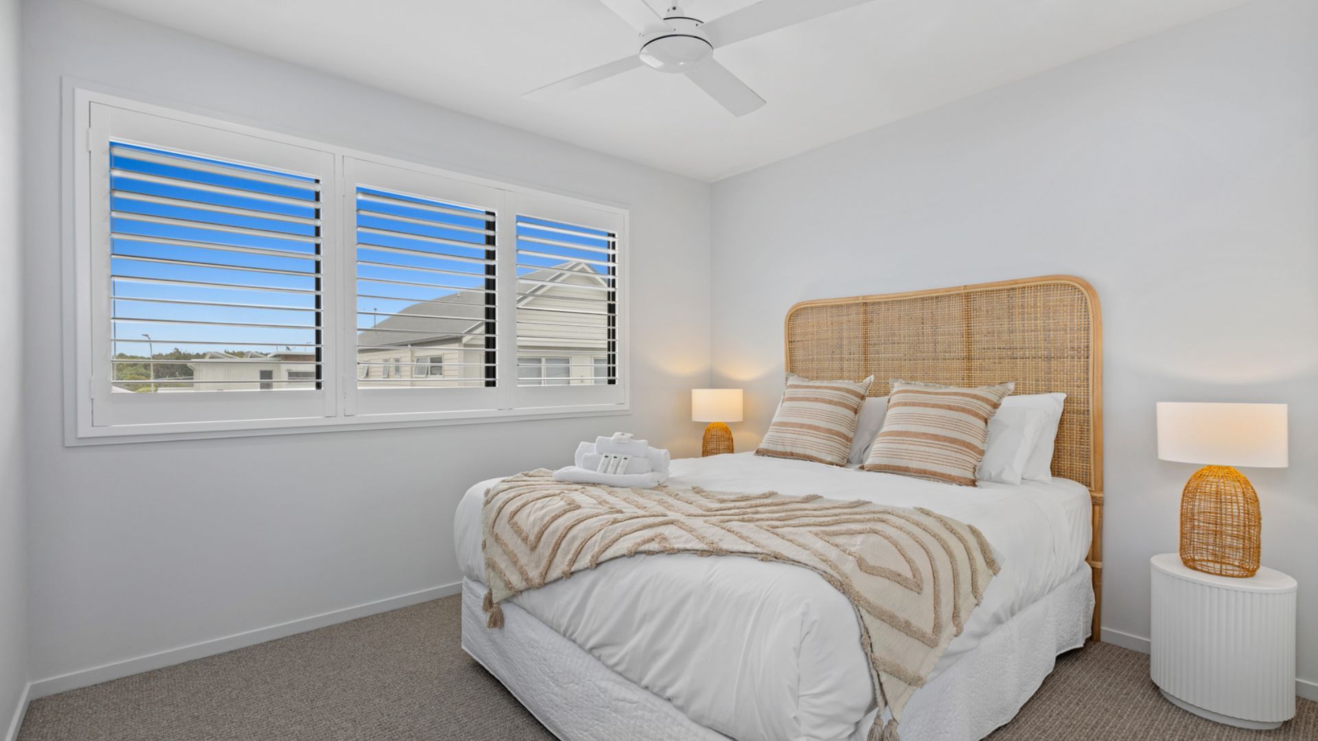 Upstairs, four well-appointed bedrooms offer comfort and space for all. The master retreat features its own balcony to catch the ocean breeze, a walk-in robe, and a private ensuite. All bedrooms include ceiling fans and plantation shutters for year-round comfort.