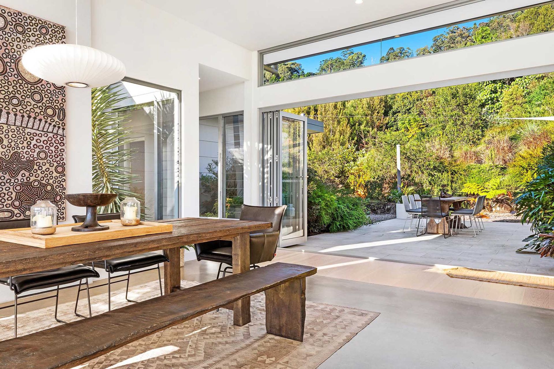 The open-plan kitchen and dining area exudes space and light, featuring high ceilings, designer pendant lighting and bi-fold glass doors that open fully to reveal the magnificent outdoor entertaining area. The kitchen combines sleek aesthetics with functionality, boasting an induction cooktop, premium Miele stainless steel appliances and a walk-in pantry. The dining space showcases a whitewashed timber table seating 6, illuminated by abundant natural light through the surrounding floor-to-ceiling windows.