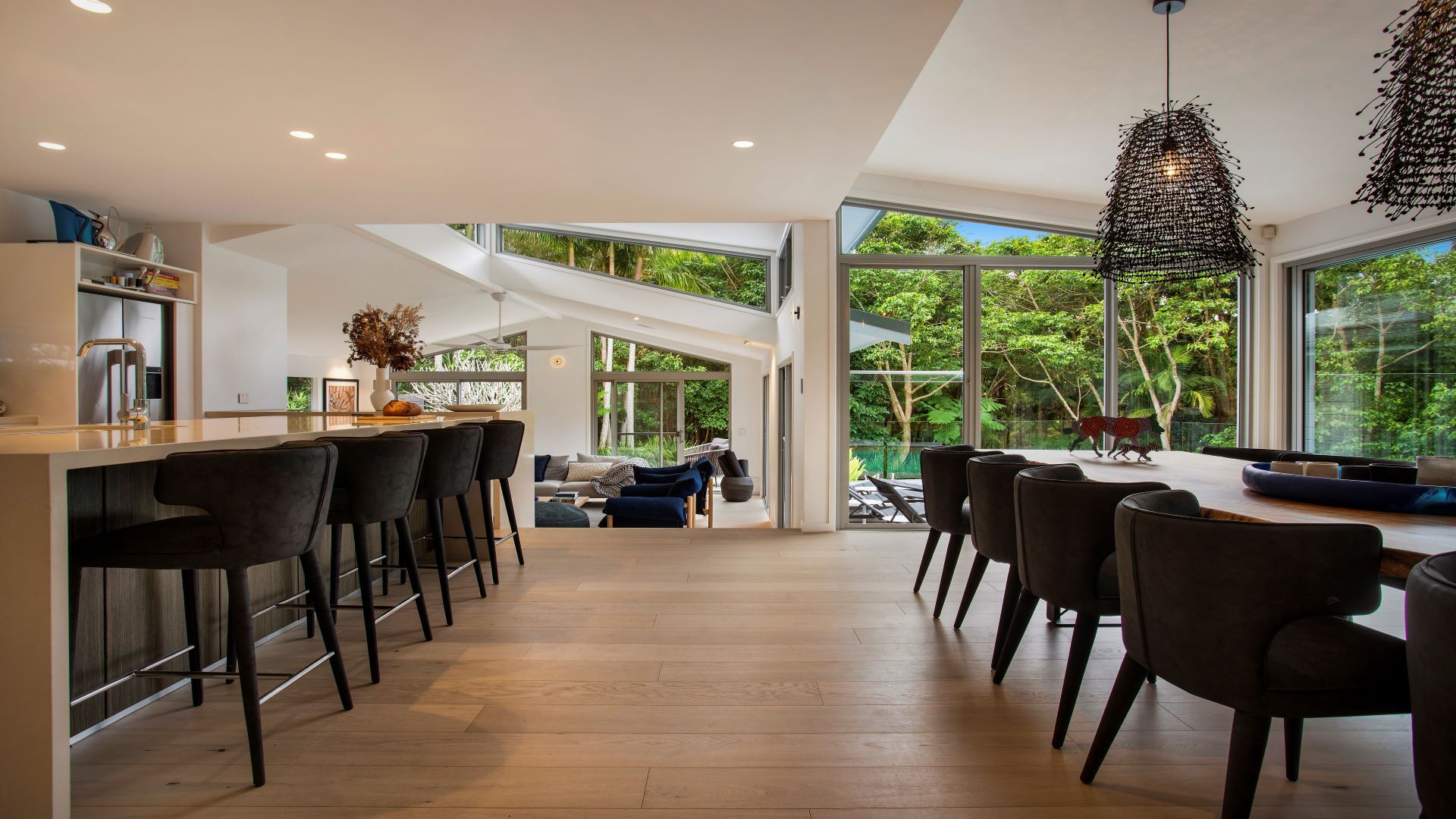 Multiple wide deck areas invite you to entertain or simply bask in the warmth of the sun, watch native birds, or listen to the ocean's rhythm. Practice morning yoga on the side deck, or savour a leisurely lunch on the main deck. Luxurious modern lounges overlook the sparkling pool, ideally positioned to create memorable moments with cherished company.
