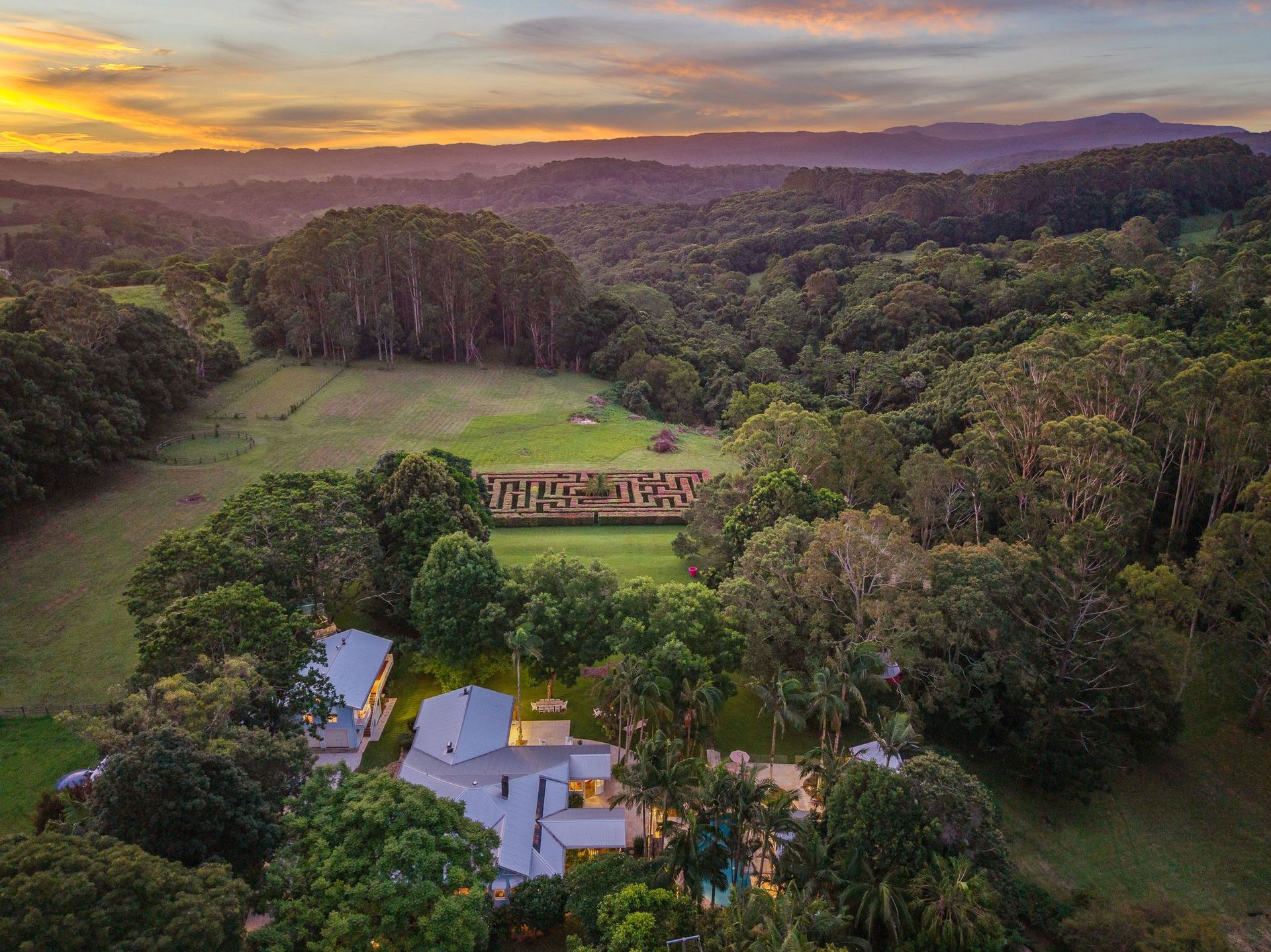 The property itself offers unique features, including a double-storey treehouse—a charming elevated retreat nestled among the trees with panoramic forest views—and a custom-landscaped maze thoughtfully designed within sculpted gardens. Set in a remote location about 25 km from Byron Bay, the estate provides a tranquil escape but may feel isolated for guests accustomed to urban conveniences. Access is via Federal Drive, a scenic route that may not suit those seeking close proximity to city amenities.