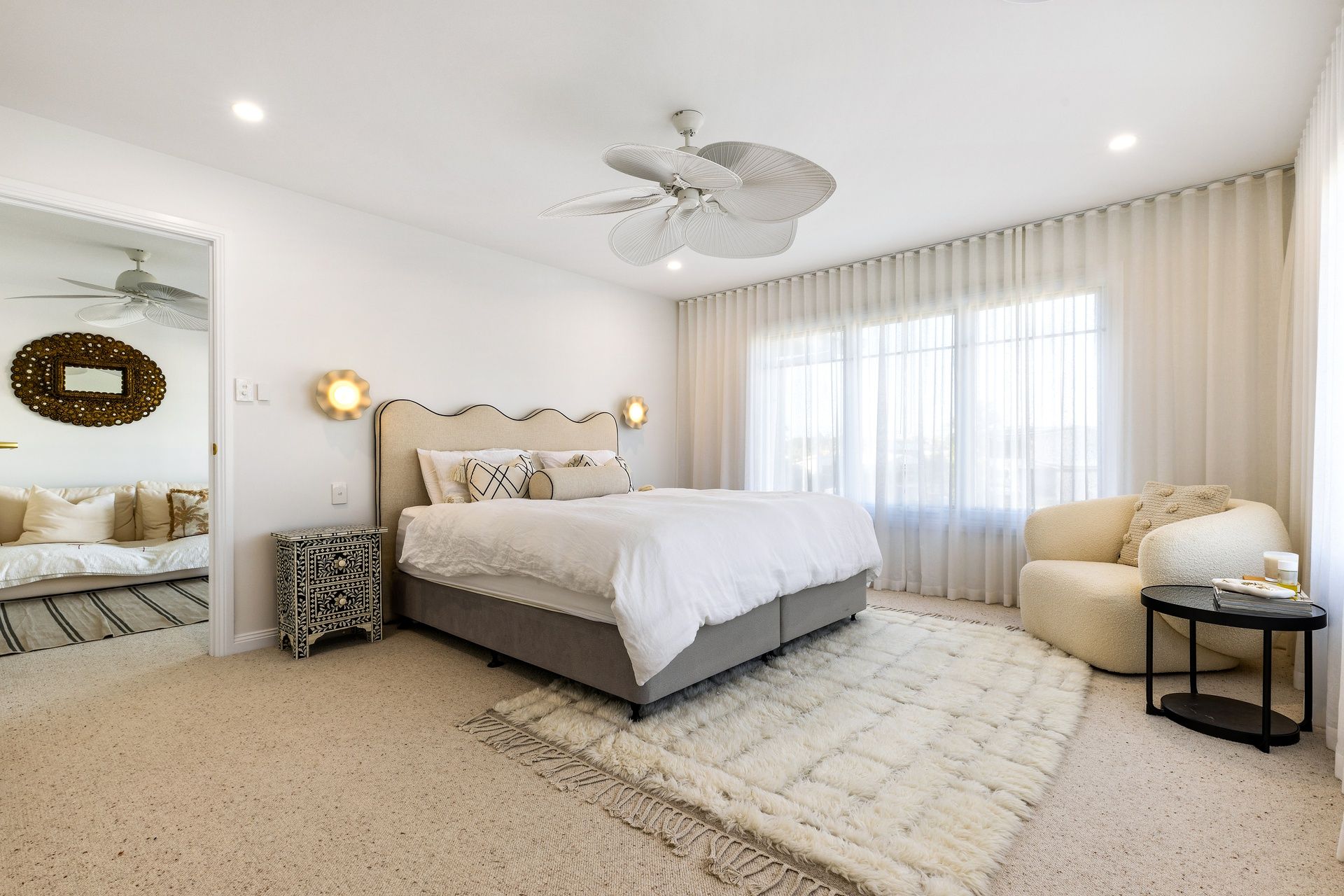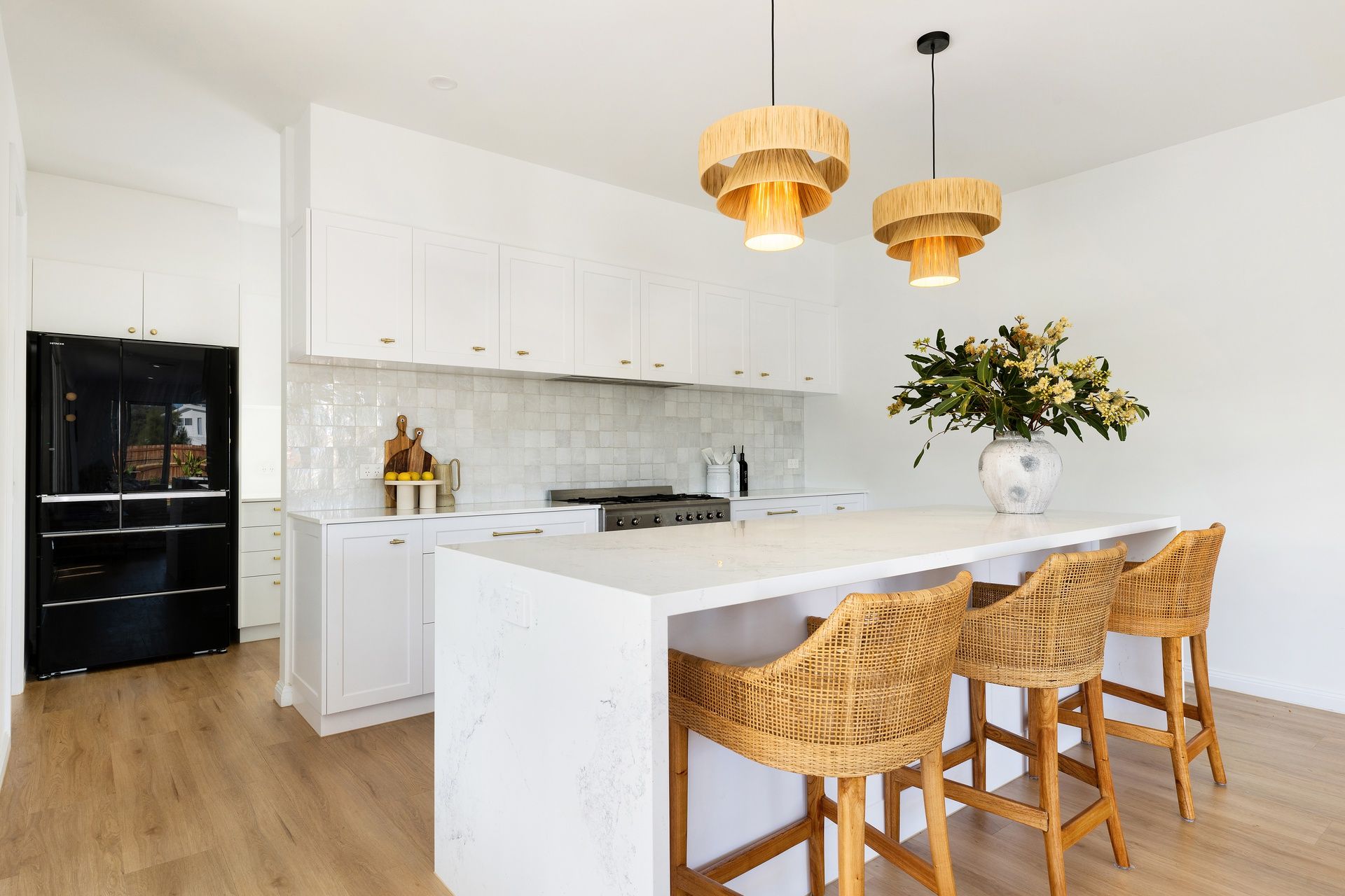 Natural light floods the thoughtfully designed interior, creating an atmosphere of refined coastal charm. The open-plan living space seamlessly connects the lounge, dining area, and kitchen, elegantly furnished for gathering with loved ones or enjoying culinary delights together.